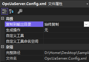 ApplicationInstance是OPC UA標(biāo)準(zhǔn)庫(kù)中用于配置并承載OPC UA Server和檢查證書的類。application.ConfigSectionName指定了配置文件的名稱,配置文件是xml文件,將會(huì)在程序文件夾查找名為OpcUaServer.Config.xml的配置文件。配置文件內(nèi)容見后文。application.LoadApplicationConfiguration加載前面指定的配置文件。如果不想使用配置文件,也可通過代碼給application.ApplicationConfiguration賦值。- 有