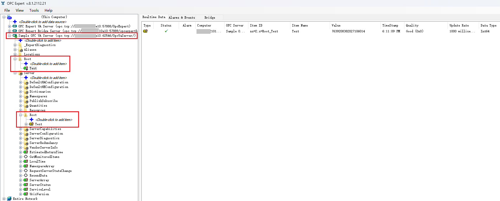 瀏覽本地計(jì)算機(jī)可發(fā)現(xiàn)OPC UA服務(wù)器,可看到添加的Root節(jié)點(diǎn)和Test變量,Test變量的值會(huì)每秒更新。