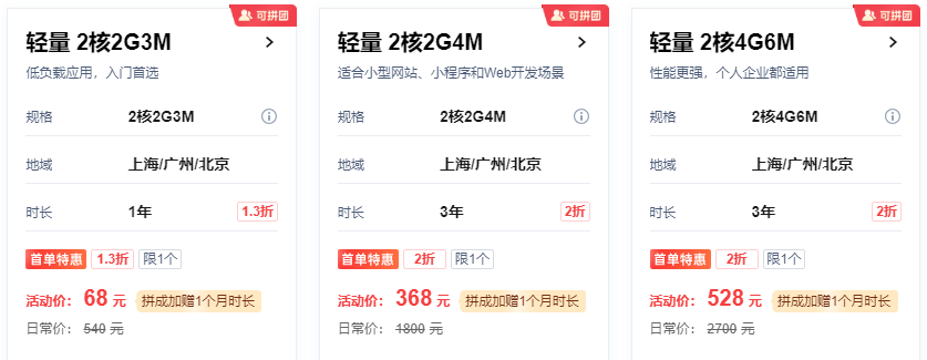 今天推薦的是騰訊云服務(wù)器,騰訊云之前推出的200M大帶寬輕量服務(wù)器,好像是太火了,賣斷貨了,而且輕量服務(wù)器開始部分支持IPv6,因此非常搶手。目前比較火熱的幾個產(chǎn)品,尤其是前兩個:1、2核4G6M輕量服務(wù)器,528元3年(力薦)2、2核2G4M輕量服務(wù)器,368元3年(力薦)3、2核2G30M輕量服務(wù)器,99元1年,海外機(jī)房4、2核4G5M輕量服務(wù)器,208元1年,送3個月