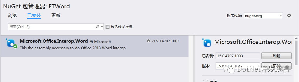 在項目中,點擊項目名稱右鍵-->管理NuGet程序包,打開NuGet包管理器窗口,進(jìn)行搜索下載即可,如下圖所示: