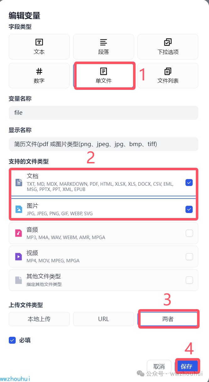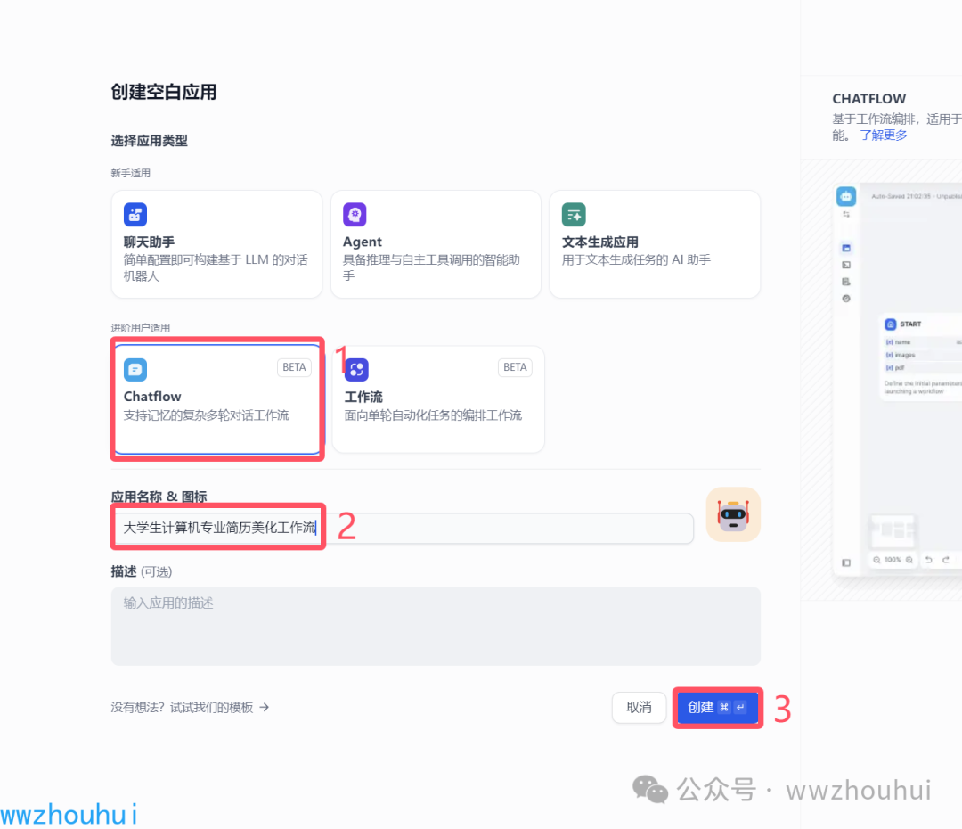 話不多說(shuō)下面帶大家實(shí)際操作一下實(shí)現(xiàn)這個(gè)工作流。 2.工作流的制作首先這個(gè)工作流由開(kāi)始節(jié)點(diǎn)、模板轉(zhuǎn)換、條件分支、文檔提取器、文本類大模型、多模態(tài)大模型、直接回復(fù)等組成。 我們首先還是先創(chuàng)建一個(gè)chatflow 工作流 開(kāi)始這個(gè)開(kāi)始節(jié)點(diǎn)有一個(gè)參數(shù)就是文件上傳,我們這里選擇單個(gè)文件,文件類型選擇文檔和圖片