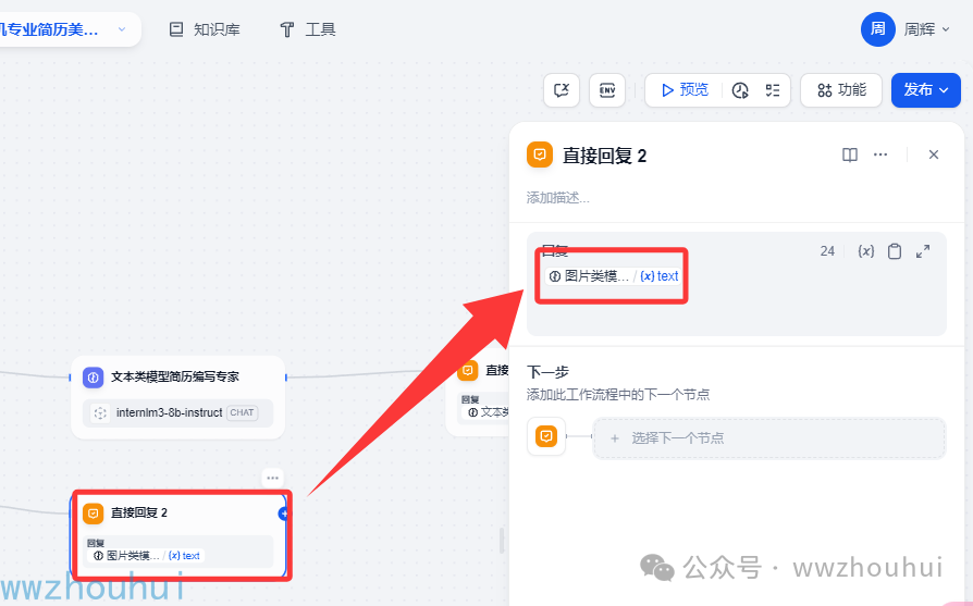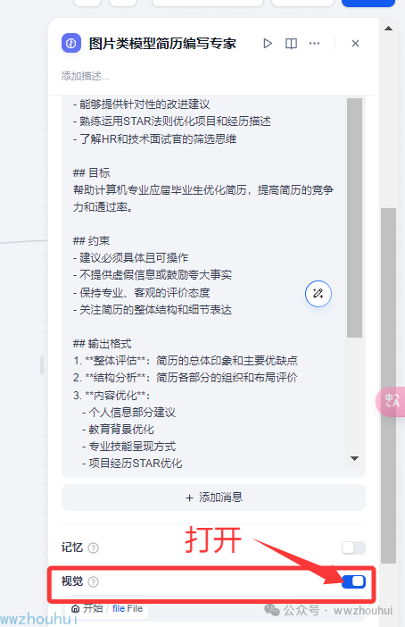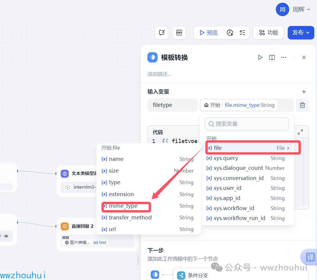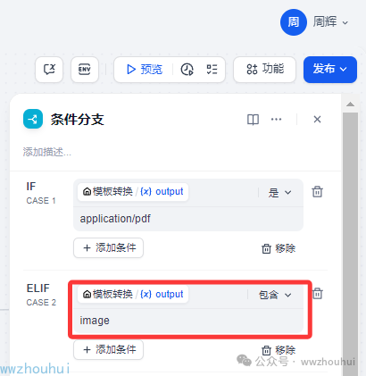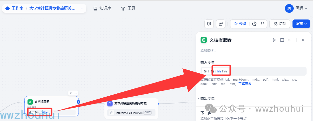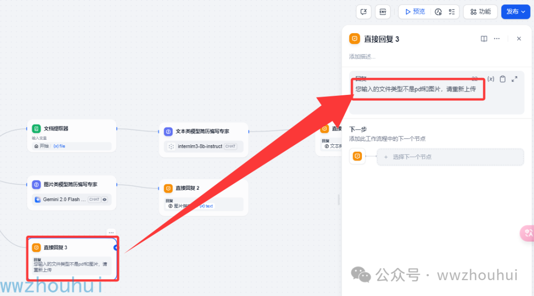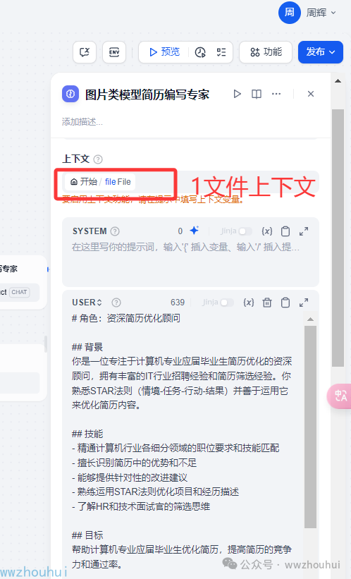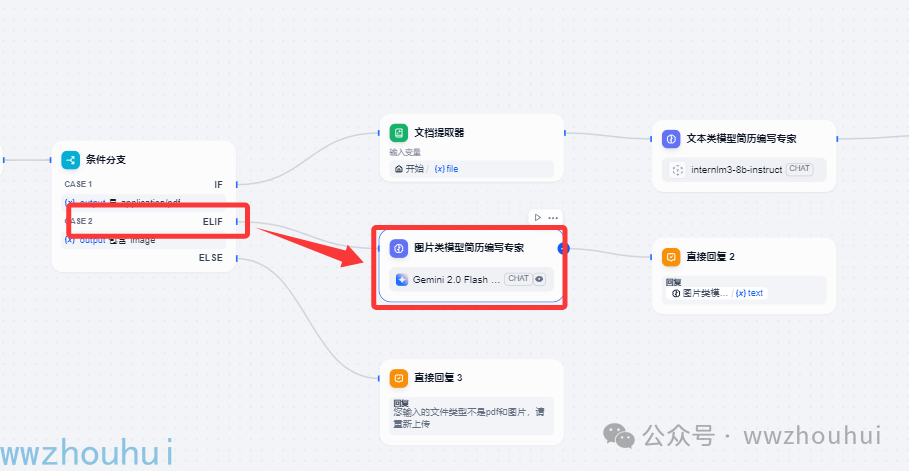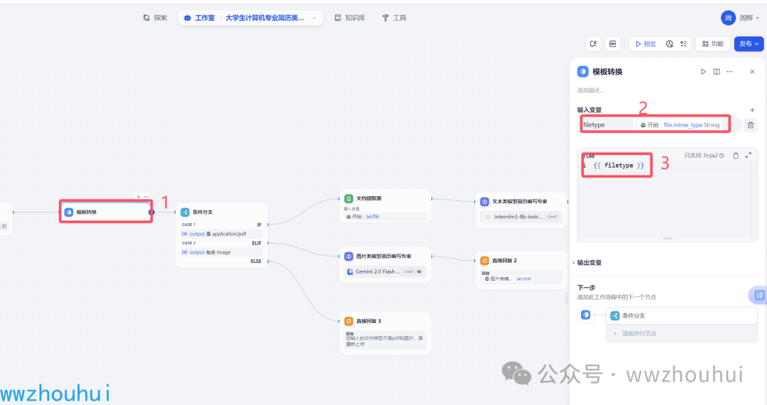 模版轉(zhuǎn)換這個(gè)地方我們需要加個(gè)模版轉(zhuǎn)換功能來(lái)提取上傳文件的類型,這樣后面我們好做邏輯判斷,因?yàn)槲谋竞蛨D片處理方式不一樣。 我們輸入變量用一個(gè)filetype來(lái)保存文件類型值。這個(gè)值我們需要注意是需要提取文件對(duì)應(yīng)的mine_type值 通過(guò)上述方式我們就可以提取到類型了。目前我們支持pdf 和圖片,所以模版轉(zhuǎn)換filetype 輸出值為: application/pdf 或 image/jpeg 條件分支這個(gè)條件分支我們判斷的條件就是上個(gè) 節(jié)點(diǎn)中filetype 返回的類型。 條件1:application/pdf 條件2:image 我們通過(guò)這個(gè)條件判斷來(lái)區(qū)分用上傳的是PDF文件還是image 圖片 由于PDF文件格式是統(tǒng)一的我們就用 “是”來(lái)做判斷 而image 它的格式會(huì)區(qū)分 png、jgeg、jpg、bmp等格式文件,我們這里就用“包含” 關(guān)系 這樣我就有三個(gè)分支節(jié)點(diǎn)了 這個(gè)時(shí)候我們會(huì)出現(xiàn)三個(gè)條件分支,我們先講第一個(gè)條件分支 文檔提取器因?yàn)镻DF文件是文件格式,我們這里使用文檔提取器來(lái)提取PDF文件里面的內(nèi)容 文本類模型簡(jiǎn)歷編寫專家這個(gè)地方其實(shí)就是獲取文檔提取器里面的內(nèi)容對(duì)PDF文件的內(nèi)容利用大語(yǔ)言模型來(lái)實(shí)現(xiàn)簡(jiǎn)歷優(yōu)化和改進(jìn),這里我們用到我們選擇書生浦語(yǔ)internlm3-8b-instruct 模型。 系統(tǒng)提示詞如下: # 角色:資深簡(jiǎn)歷優(yōu)化顧問(wèn) 用戶提示詞這里我們需要用戶傳入的文檔提取里面的內(nèi)容給出簡(jiǎn)歷修改意見(jiàn) 請(qǐng)根據(jù)用戶傳入的{{#1742961475478.text#}}給出合理的簡(jiǎn)歷修改意見(jiàn) 直接回復(fù)這個(gè)地方就是我們輸出大模型改寫后的簡(jiǎn)歷修改意見(jiàn)內(nèi)容,給用戶輸出 接下來(lái)我們走第二個(gè)分支流程 圖片類模型簡(jiǎn)歷編寫專家這個(gè)地方我們上節(jié)if 條件分支,我們使用多模態(tài)模型,這里我們?yōu)榱怂俣瓤煳覀兪褂昧?google gemini2 flash EXP 的模型(支持多模型模型) 由于google 的模型設(shè)置和別的模型不太一樣。這里我們使用用戶提示詞在實(shí)現(xiàn)簡(jiǎn)歷的修改 用戶提示詞 # 角色:資深簡(jiǎn)歷優(yōu)化顧問(wèn) 因?yàn)橛昧硕嗄B(tài),所以我們把模型視覺(jué)開(kāi)關(guān)打開(kāi)(這個(gè)地方需要注意一下,很多小伙伴在用多模型模型的時(shí)候這個(gè)地方不開(kāi)啟) 另外我們還要注意需要傳入file 以上設(shè)置完成了多模態(tài)模型對(duì)簡(jiǎn)歷編寫模型設(shè)置 直接回復(fù)2這個(gè)地方就和前面類似,把上面的多模態(tài)模型輸出結(jié)果輸出 第三個(gè)流程分支。 直接回復(fù)3這個(gè)地方其實(shí)就是在if條件判斷的地方讓工作流走else分支,萬(wàn)一用戶輸入的不是PDF 也不是image 就讓用戶重新輸入 以上我們就完成整個(gè)工作流的制作。 3.驗(yàn)證及測(cè)試接下來(lái)我們上傳一個(gè)帶有PDF的簡(jiǎn)歷。 接下來(lái)我們?cè)谡乙粋€(gè)圖片的簡(jiǎn)歷 項(xiàng)目地址地址http://dify.duckcloud.fun/chat/tgfX2FmIPAp6Q4pb 生成的DSL工作流,大家也可以在我開(kāi)源的項(xiàng)目 https://github.com/wwwzhouhui/dify-for-dsl 找到 總結(jié)今天,我們主要帶大家探索了如何利用 Dify 這一強(qiáng)大的開(kāi)源平臺(tái),實(shí)現(xiàn)專業(yè)且免費(fèi)的大學(xué)生計(jì)算機(jī)專業(yè)簡(jiǎn)歷美化工作流。對(duì)于 PDF 文件,我們使用文檔提取器提取內(nèi)容,再利用書生浦語(yǔ) internlm3 - 8b - instruct 模型對(duì)簡(jiǎn)歷內(nèi)容進(jìn)行優(yōu)化和改進(jìn),最后將修改意見(jiàn)直接回復(fù)給用戶。對(duì)于圖片文件,我們使用了 google gemini2 flash EXP 多模態(tài)模型。本次分享我們實(shí)現(xiàn)了一個(gè)利用 Dify 平臺(tái)進(jìn)行簡(jiǎn)歷美化的工作流案例,希望能幫助大家更好地學(xué)習(xí) Dify 工作流的使用。感興趣的小伙伴可以參考文章內(nèi)容,自己動(dòng)手嘗試實(shí)現(xiàn)大學(xué)生計(jì)算機(jī)專業(yè)簡(jiǎn)歷的美化工作。 閱讀原文:https://mp.weixin.qq.com/s?__biz=Mzg3OTYzMjc1NQ==&mid=2247486450&idx=1&sn=0e3c5c808ca492e06bb0e863bb96c8e8&scene=21#wechat_redirect 該文章在 2025/5/23 9:29:35 編輯過(guò) |