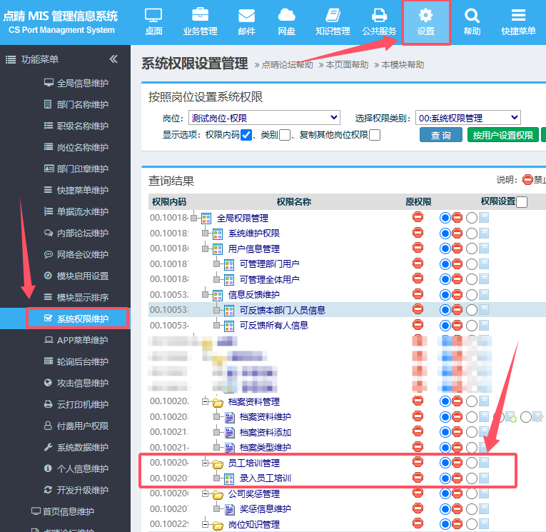 :請問員工培訓(xùn)管理中培訓(xùn)錄入維護權(quán)限在哪里設(shè)置?![]() 以管理員身份登錄點晴MIS系統(tǒng),進入:設(shè)置-》系統(tǒng)維護設(shè)置-》系統(tǒng)維護管理-》系統(tǒng)權(quán)限維護: ? 選擇需要設(shè)置使用權(quán)限的崗位或人員,選擇權(quán)限類別為:“00:系統(tǒng)權(quán)限管理”,找到權(quán)限項目:員工培訓(xùn)管理、錄入員工培訓(xùn),勾選權(quán)限,保存即可。