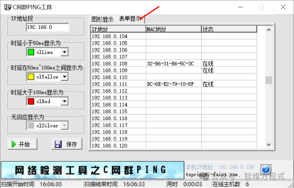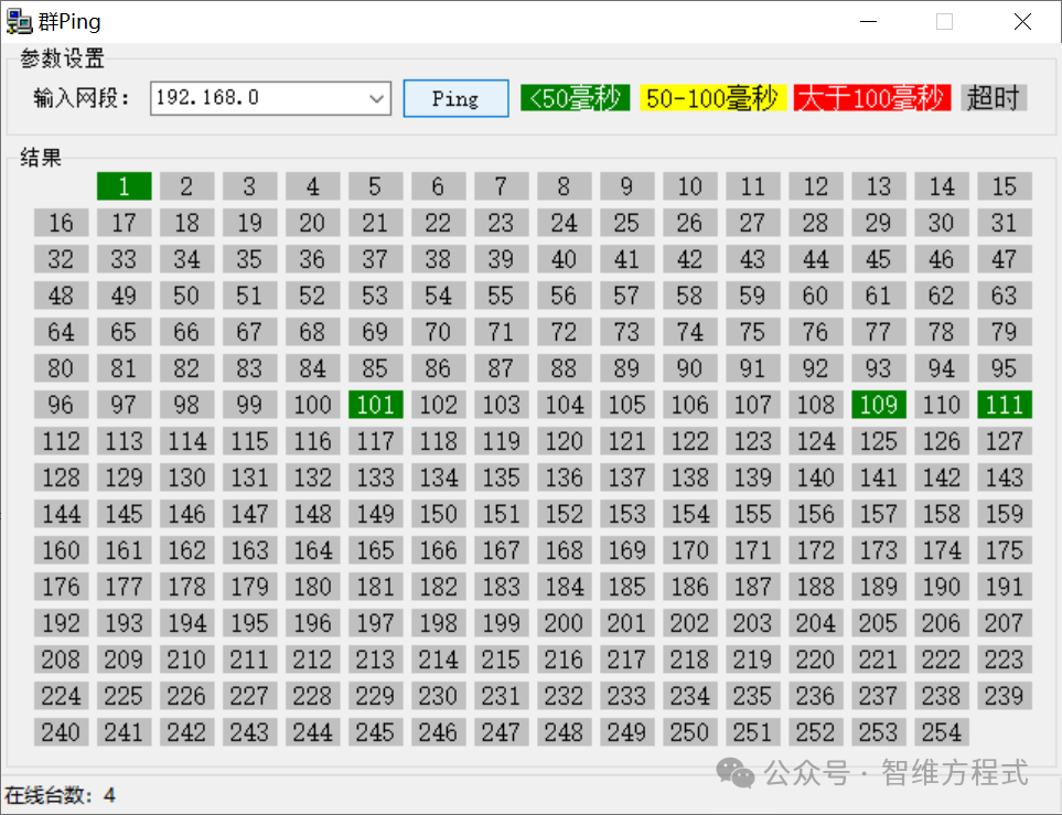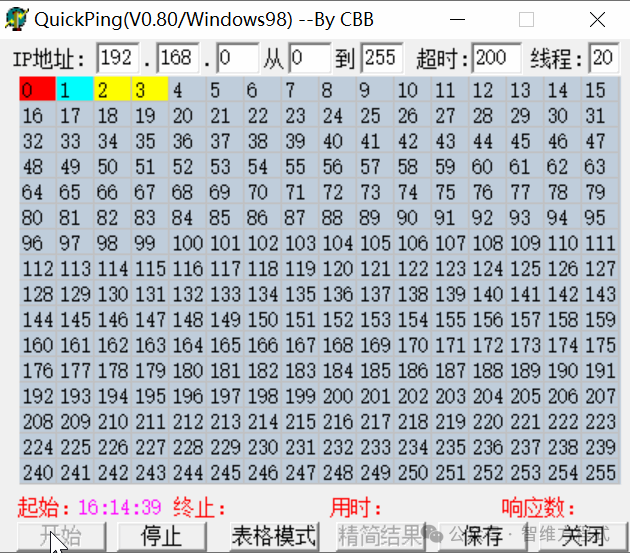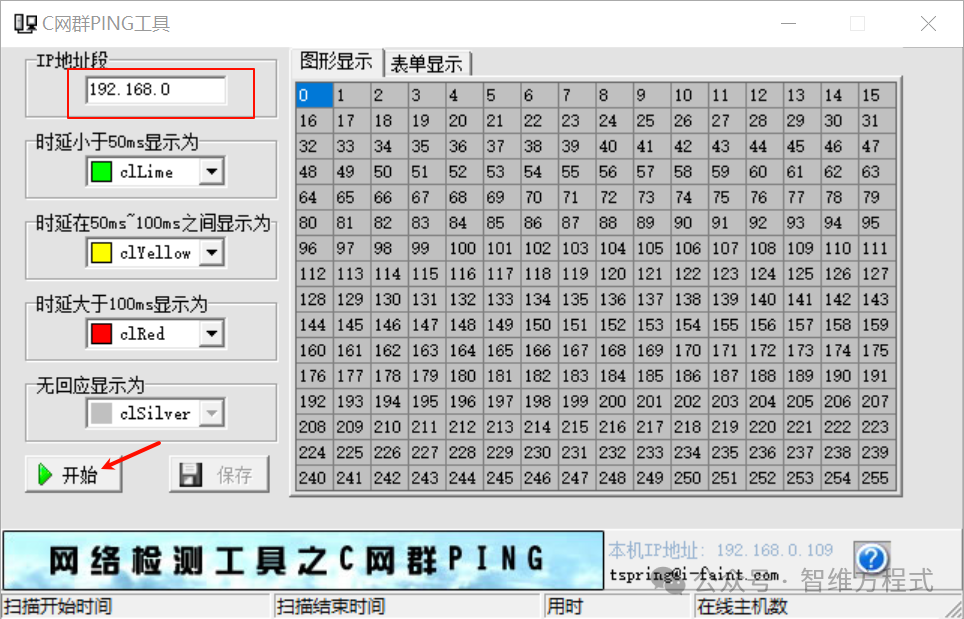 2、C網(wǎng)群Ping工具這款小工具對于做網(wǎng)絡(luò)、弱電類的,非常有作用,小巧且實用,菜單也非常簡單,很方便輸入目標(biāo)地址段顏色選擇,點擊開始就可以掃描。輸入IP地址段,然后點開始即可,如圖: