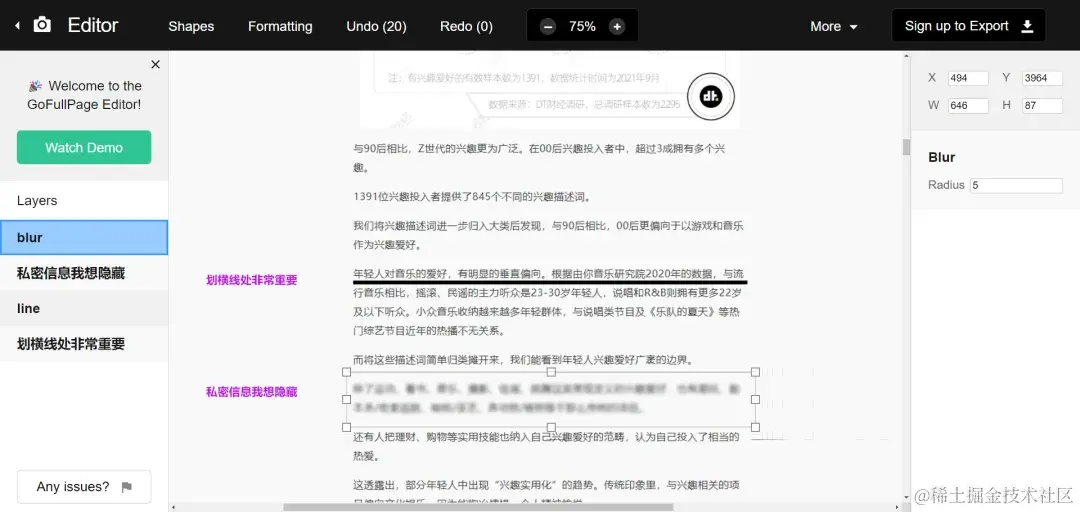 通過上面實(shí)操結(jié)果我們會發(fā)現(xiàn),我可以確定目標(biāo)文章,然后點(diǎn)擊插件快照即可自動截取全文內(nèi)容,還可進(jìn)行編輯突出重點(diǎn),隱藏某些敏感信息,可以說是非常實(shí)用的插件了。