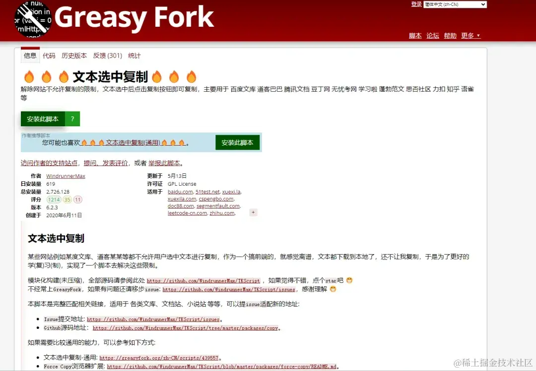 既不想便宜它,又不能上班還付費(fèi)吧,那總得來點(diǎn)招治一治它。那就安裝文本復(fù)制的腳本,安裝之后重新刷新是真的服服帖帖,專制流氓。除了這個(gè),可以在腳本市場逛逛,你能發(fā)現(xiàn)非常多的新大陸給你帶來驚喜。