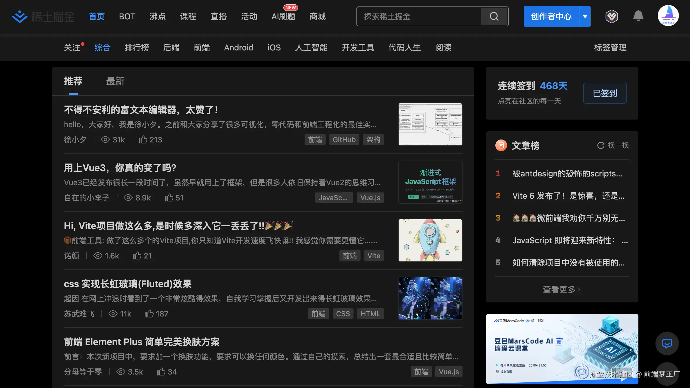 首先,先來看實(shí)現(xiàn)效果,以給掘金網(wǎng)站加入暗黑模式為例,暗黑版掘金網(wǎng)站效果如下: