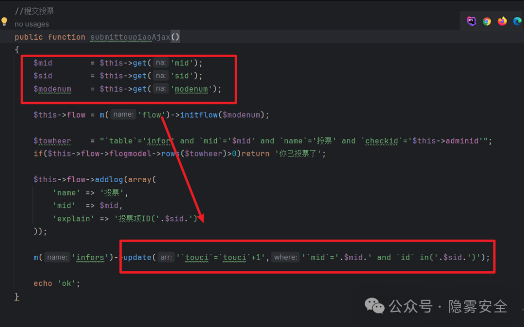 通過跟蹤 SQL 執(zhí)行,可以看到實際上執(zhí)行的是以下 sql 語句 update `xinhu_infors` set `touci`=`touci`+1 where `mid`=3 and `id` in(1)