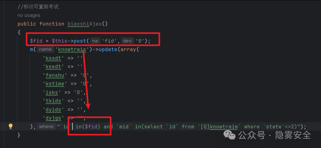 可以發(fā)現(xiàn)它對傳入?yún)?shù)沒有進行任何的過濾便拼接執(zhí)行 SQL 注入 url: http:update `xinhu_knowtrais` set`kssdt`=null,`ksedt`=null,`fenshu`='0',`kstime`='0',`isks`='0',`tkids`=null,`dyids`=null,`dyjgs`=null where `id` in(1) and `mid` in(select `id` from`[Q]knowtraim` where `state`<>