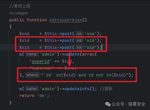 通過跟蹤 SQL 執(zhí)行,可以看到實際上執(zhí)行的是以下 sql 語句 update `xinhu_admin` set `superid`='1',`superman`='1' where `id` in(1) and idnot in(1)