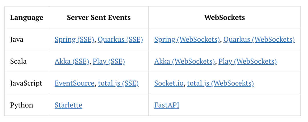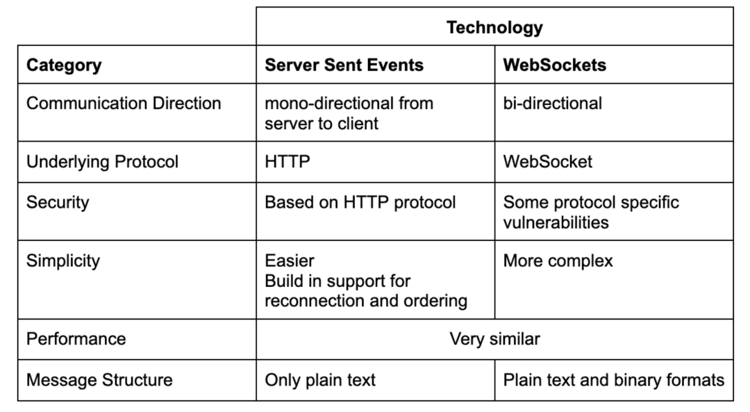 在今天的博文中,我想深入探討服務(wù)器發(fā)送事件(簡(jiǎn)稱SSE)和WebSockets。這兩種方法都是經(jīng)過(guò)實(shí)戰(zhàn)考驗(yàn)的數(shù)據(jù)交換方式。 我將首先簡(jiǎn)要介紹這兩種工具的特性——它們是什么以及提供什么功能。然后,我會(huì)根據(jù)八個(gè)類別對(duì)它們進(jìn)行比較,我認(rèn)為這些類別對(duì)于現(xiàn)代系統(tǒng)來(lái)說(shuō)最為關(guān)鍵。 與我之前比較REST和qRPC不同,我不會(huì)在每個(gè)類別中宣布任何勝者或授予分?jǐn)?shù)。相反,在“總結(jié)”段落中,你會(huì)找到一個(gè)類似TL;DR的表格。該表格包含在上述領(lǐng)域中兩種技術(shù)的關(guān)鍵差異。 與REST不同,SSE和WebSockets都更專注于特定的用例。在這種情況下,這兩個(gè)概念的主要關(guān)注點(diǎn)是提供一個(gè)“實(shí)時(shí)”通信媒介。由于它們的特定關(guān)注點(diǎn),它們不如REST流行,REST是一種更通用的、一刀切的工具。 不過(guò),SSE和WebSockets都提供了一組有趣的可能性,為經(jīng)典的REST方法解決復(fù)雜問(wèn)題提供了輕微的更新。在我看來(lái),最好了解它們并在我們的工具箱中為它們找到一席之地,因?yàn)橛幸惶焖鼈兛赡軙?huì)派上用場(chǎng)。當(dāng)你需要“實(shí)時(shí)”更新或你的應(yīng)用程序需要更推送導(dǎo)向的方法時(shí),它們可以為你提供一個(gè)更簡(jiǎn)單的解決方案。 簡(jiǎn)而言之,它是一種通信協(xié)議,通過(guò)使用一個(gè)持久的TCP連接在服務(wù)器和客戶端之間提供雙向通信。由于這一特性,我們不必不斷從服務(wù)器拉取新數(shù)據(jù)。相反,數(shù)據(jù)在相關(guān)方之間“實(shí)時(shí)”交換。每個(gè)消息要么是二進(jìn)制數(shù)據(jù),要么是Unicode文本。 該協(xié)議于2011年由IETF以RFC 6455的形式標(biāo)準(zhǔn)化。WebSocket協(xié)議與HTTP不同,但兩者都位于OSI模型的第七層,并依賴第四層的TCP。 該協(xié)議有一套獨(dú)特的前綴,類似于HTTP的http和https前綴: 此外,從安全站點(diǎn)(https)不應(yīng)打開(kāi)非安全的WebSocket連接(ws)。類似地,從非安全站點(diǎn)(http)不應(yīng)打開(kāi)安全的WebSocket連接(wss)。 另一方面,WebSocket按設(shè)計(jì)在HTTP端口443和80上工作,并支持HTTP概念,如代理和中間件。此外,WebSocket握手使用HTTP升級(jí)頭來(lái)將協(xié)議從HTTP升級(jí)到WebSocket。 WebSocket作為一個(gè)協(xié)議的最大缺點(diǎn)是安全性。WebSocket不受同源策略的限制,這可能使類似CSRF的攻擊更容易。 SSE是一種允許網(wǎng)絡(luò)服務(wù)器向網(wǎng)頁(yè)發(fā)送更新的技術(shù)。它是HTML 5規(guī)范的一部分,與WebSockets類似,使用一個(gè)持久的HTTP連接來(lái)“實(shí)時(shí)”發(fā)送數(shù)據(jù)。在概念層面上,它是一種相當(dāng)古老的技術(shù),其理論背景可以追溯到2004年。2006年,Opera團(tuán)隊(duì)首次嘗試實(shí)現(xiàn)SSE。 SSE得到了大多數(shù)現(xiàn)代瀏覽器的支持——Microsoft Edge于2020年1月添加了SSE支持。它還可以充分利用HTTP/2,這實(shí)際上消除了SSE的一個(gè)最大問(wèn)題,即實(shí)際上消除了HTTP/1.1所施加的連接限制。 根據(jù)規(guī)范,服務(wù)器發(fā)送事件有兩個(gè)基本構(gòu)建塊: 根據(jù)規(guī)范,事件可以攜帶任意文本數(shù)據(jù),一個(gè)可選的ID,并由換行符分隔。它們甚至有其獨(dú)特的MIME類型:text/event-stream。 此外,SSE提供了兩個(gè)非常有趣的特性: 可能是這兩種技術(shù)之間最大的區(qū)別在于它們的通信方式。 我會(huì)在接下來(lái)的段落中描述所有這些領(lǐng)域以及更多內(nèi)容。此外,在所有情況下使用WebSocket可能是一個(gè)重大過(guò)度,基于SSE的解決方案可能更簡(jiǎn)單易行。 這里出現(xiàn)了這兩種技術(shù)之間的另一個(gè)重大區(qū)別。 在SSE的情況下,使用HTTP/2解決了SSE的一個(gè)主要問(wèn)題——最大并行連接限制。HTTP/1.1根據(jù)其規(guī)范限制并行連接的數(shù)量。 這種行為可能導(dǎo)致一個(gè)稱為頭部阻塞的問(wèn)題。HTTP/2通過(guò)引入多路復(fù)用解決了這個(gè)問(wèn)題,從而在應(yīng)用層解決了頭部阻塞問(wèn)題。然而,TCP級(jí)別的頭部阻塞仍然可能發(fā)生。 至于WebSocket協(xié)議,我在上面幾行中已經(jīng)詳細(xì)提及。在這里,我只會(huì)重申最重要的幾點(diǎn)。該協(xié)議與經(jīng)典的HTTP有些不同,盡管使用HTTP升級(jí)頭來(lái)初始化WebSocket連接并有效地更改通信協(xié)議。 盡管如此,它還以TCP協(xié)議為基礎(chǔ),并且與HTTP完全兼容。WebSocket協(xié)議最大的缺點(diǎn)是其安全性。 一般來(lái)說(shuō),設(shè)置基于SSE的集成比其WebSocket對(duì)應(yīng)物更簡(jiǎn)單。其背后最重要的原因是特定技術(shù)所利用的通信性質(zhì)。 SSE的單向通信方式及其推送模型在概念層面上使其更簡(jiǎn)單。結(jié)合自動(dòng)重連和流連續(xù)性支持,SSE開(kāi)箱即用,減少了我們需要處理的事情的數(shù)量。 在WebSocket的情況下,事情變得有點(diǎn)復(fù)雜。首先,我們需要處理從HTTP到WebSocket協(xié)議的連接升級(jí)。盡管這是最簡(jiǎn)單的事情之一,但仍然是我們需要記住的另一件事。 第二個(gè)問(wèn)題是WebSocket的雙向性質(zhì)。我們必須管理特定連接的狀態(tài),并處理在處理消息時(shí)發(fā)生的所有可能