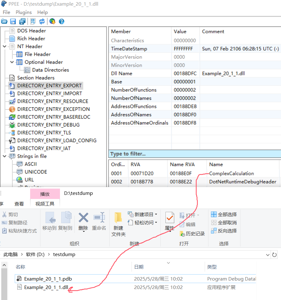 生成好 dll 之后可以用 PPEE 工具觀察下 export 表,打開(kāi)之后果然有了 ComplexCalculation