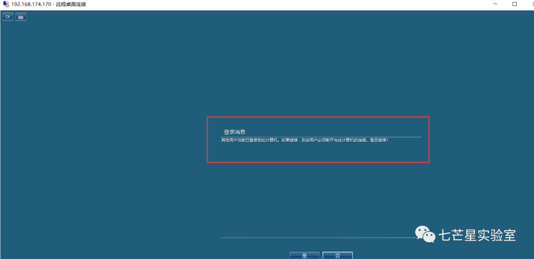 之后會(huì)提示"其他用戶當(dāng)前已登錄到此計(jì)算機(jī),如果繼續(xù),則該用戶必須斷開與此計(jì)算機(jī)的鏈接,是否繼續(xù)?"