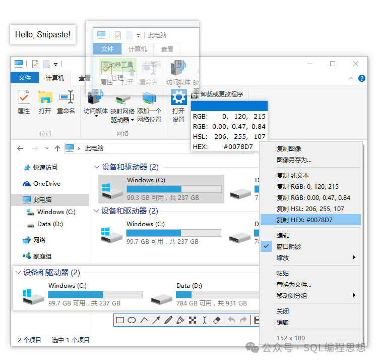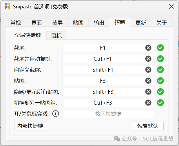 ![]() Snipaste 還可以快速標(biāo)注界面元素,截圖時選中矩形、橢圓、或者記號筆/馬賽克/橡皮擦的矩形填充畫筆,按下鼠標(biāo)右鍵即可自動選中界面元素。 ![]() 創(chuàng)新貼圖所謂貼圖,是指將系統(tǒng)剪貼板中的內(nèi)容(圖像、純文本、HTML 文本、顏色信息、圖像文件等)轉(zhuǎn)化成圖片,然后作為窗口置頂顯示。 ![]() 圖片窗口支持的操作包括縮放、旋轉(zhuǎn)、GIF 圖片加速/減速、上一幀/下一幀、鏡像翻轉(zhuǎn)、設(shè)置透明度、鼠標(biāo)穿透、縮略圖、圖像標(biāo)注、貼圖分組等。 命令行Snipaste 還可以支持使用命令行選項(xiàng)進(jìn)行功能調(diào)用,不過需要啟動 Snipaste 后才有效。例如,以下命令用于在 Windows 平臺進(jìn)行全屏截圖并復(fù)制到剪切板: 更多的命令行選項(xiàng)可以參考官方文檔: https://docs.snipaste.com/zh-cn/command-line-options 選項(xiàng)設(shè)置Snipaste 自定義設(shè)置可以對界面語言、快捷鍵、各種操作選項(xiàng)進(jìn)行調(diào)整,滿足個性化需求。 ![]() 下載安裝Snipaste 提供了免費(fèi)版和專業(yè)版(收費(fèi)),輸入以下地址進(jìn)行下載: https://zh.snipaste.com/download.html ?閱讀原文:https://mp.weixin.qq.com/s/StmHba0n7qDcv39fgm-DOg 該文章在 2025/6/14 16:19:24 編輯過 |