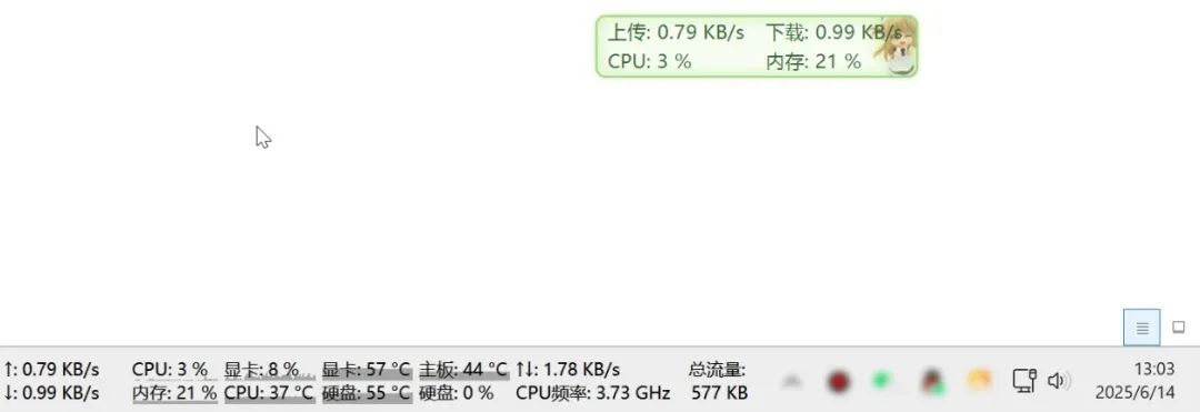 這款小工具可以在 Windows 系統(tǒng)的任務(wù)欄中顯示當(dāng)前的網(wǎng)絡(luò)使用情況,以及顯卡、內(nèi)存、CPU、硬盤的使用情況。同時,還能實時監(jiān)測主板、顯卡、CPU、硬盤的當(dāng)前溫度,讓用戶能夠時刻掌握電腦硬件的狀態(tài)。