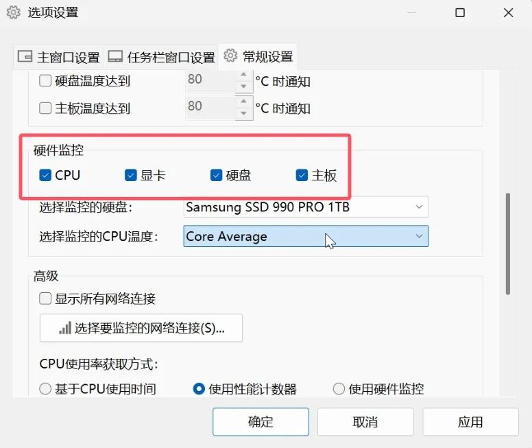 當(dāng)軟件運行后,初始界面僅顯示網(wǎng)絡(luò)監(jiān)控信息。我們可以通過點擊設(shè)置,開啟對 CPU、顯卡、硬盤、主板溫度以及它們的使用量監(jiān)控功能。