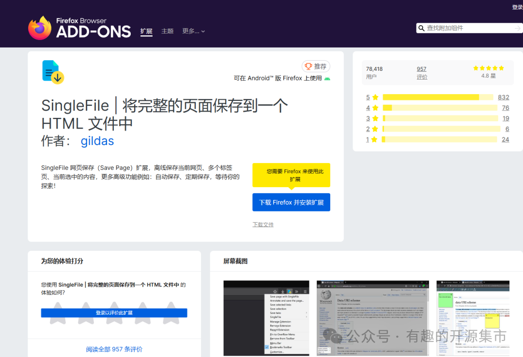 SingleFile 可以通過瀏覽器擴(kuò)展商店安裝https://addons.mozilla.org/firefox/addon/single-filehttps://chrome.google.com/extensions/detail/mpiodijhokgodhhofbcjdecpffjipklehttps://microsoftedge.microsoft.com/addons/detail/efnbkdcfmcmnhlkaijjjmhjjgladednohttps://apps.apple.com/us/app/singlefile-for-safari/id6444322545