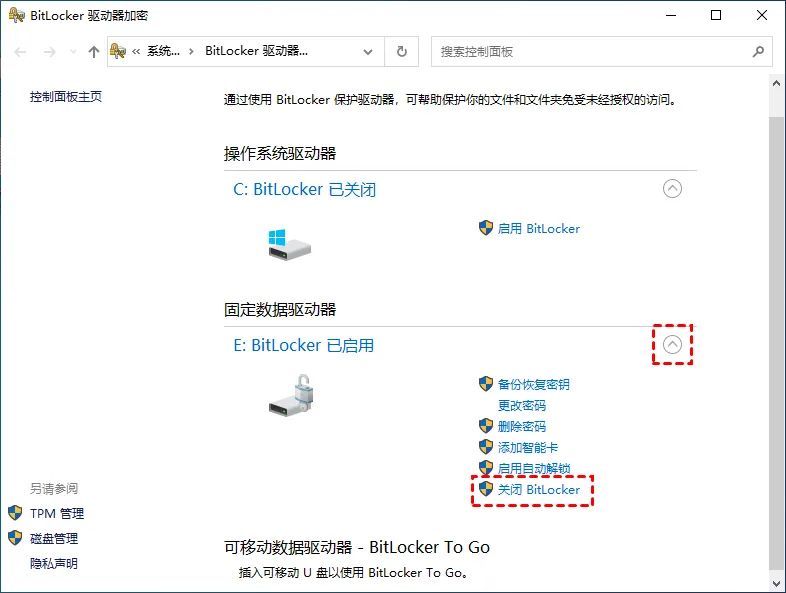找到被加密的盤(帶金色鎖圖標(biāo)??),點(diǎn)擊 關(guān)閉BitLocker。