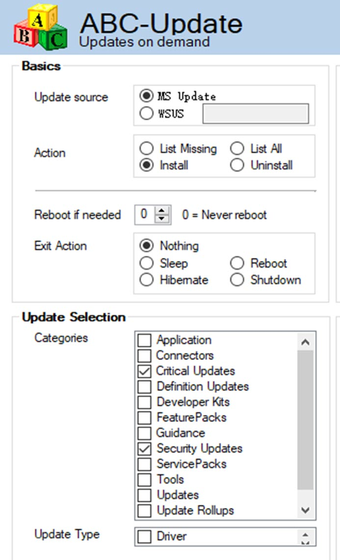 (圖1) 要自動(dòng)安裝Windows升級(jí)包,首先在Basics分組框中選擇Update source類型為MS Update。Action動(dòng)作選項(xiàng)選擇為Install,并選擇結(jié)束動(dòng)作之后的電源管理自動(dòng)操作,其中睡眠選擇Sleep,重啟選擇Reboot,休眠選擇Hibernate,關(guān)機(jī)選擇Shutdown,無動(dòng)作選擇Nothing。如果在Action選項(xiàng)中選擇List Missing,會(huì)列出尚未安裝的所有Windows可用更新。 接著,在Update Selection分組框的Categories列表中選擇更新的項(xiàng)目,含安全更新(Security Updates)、應(yīng)用更新(Application)、服務(wù)更新(ServicePacks)、功能更新(FeaturePacks)等,在Update Type中選擇軟件(Software)或驅(qū)動(dòng)(Driver)類型。