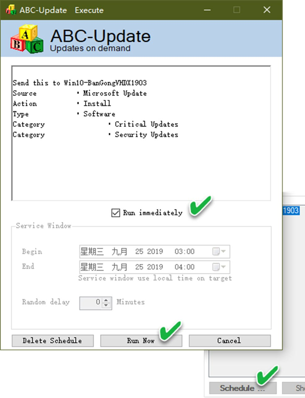 (圖2) 如果需要按照升級(jí)包的KB編號(hào)來搜索更新,在KB Article框中輸入KB編號(hào)即可。 如果要馬上運(yùn)行更新,點(diǎn)擊Schedule按鈕,選中Run immediately復(fù)選框,然后點(diǎn)擊Run Now按鈕即可