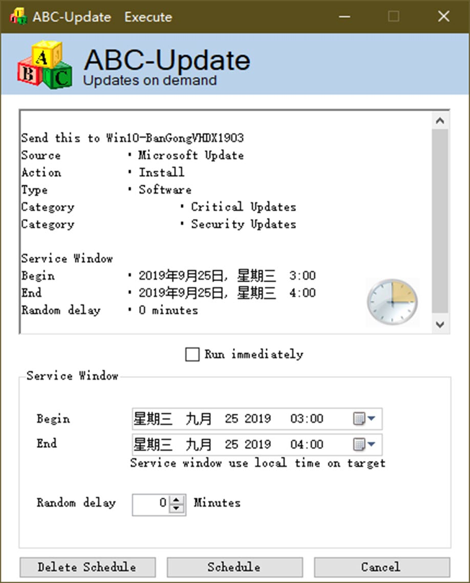 (圖3) 若是要指定計(jì)劃運(yùn)行時(shí)段,讓更新自動(dòng)按時(shí)進(jìn)行,則先取消對(duì)Run immediately復(fù)選框的選擇,再指定開始時(shí)間和終止時(shí)間,最后點(diǎn)擊Schedule按鈕,讓計(jì)劃生效。