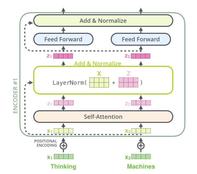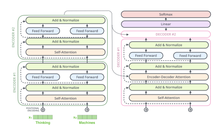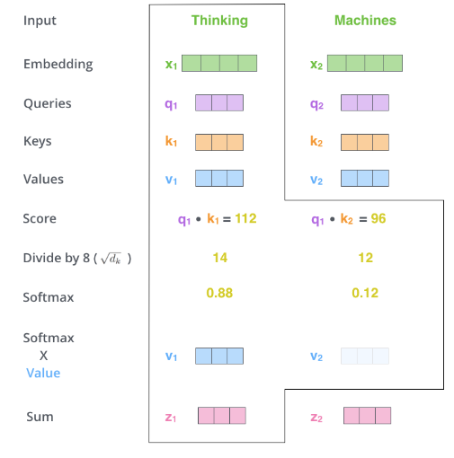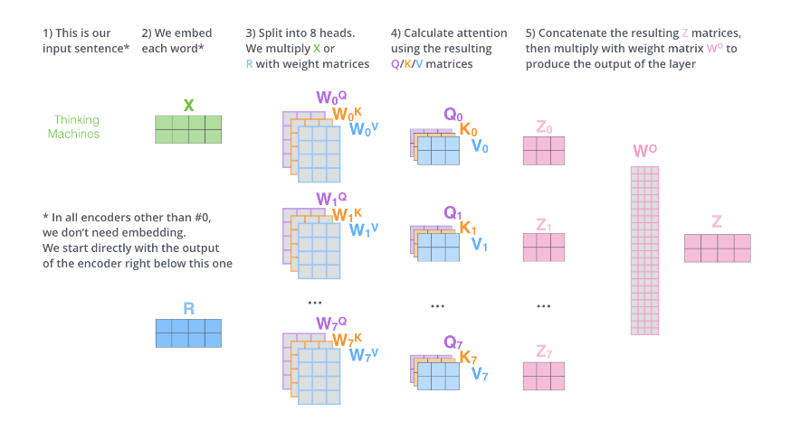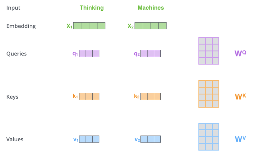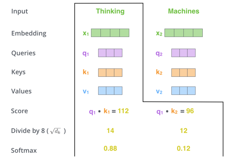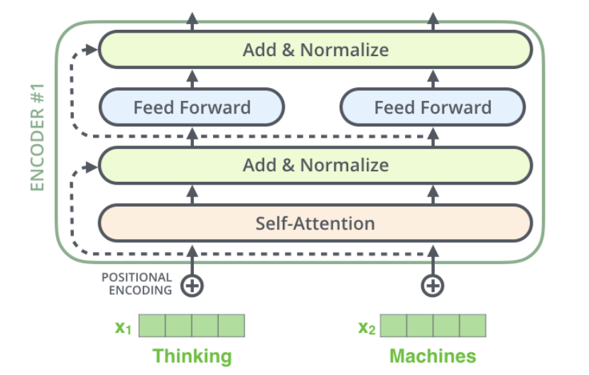 前言 transformer是目前NLP甚至是整個深度學(xué)習(xí)領(lǐng)域不能不提到的框架,同時大部分LLM也是使用其進(jìn)行訓(xùn)練生成模型,所以transformer幾乎是目前每一個機器人開發(fā)者或者人工智能開發(fā)者不能越過的一個框架。接下來本文將從頂層往下去一步步掀開transformer的面紗。 transformer概述 Transformer模型來自論文Attention Is All You Need。(https://arxiv.org/abs/1706.03762) 在論文中最初是為了提高機器翻譯的效率,它使用了Self-Attention機制和Position Encoding去替代RNN。后來大家發(fā)現(xiàn)Self-Attention的效果很好,并且在其它的地方也可以使用Transformer模型。并引出后面的BERT和GPT系列。 大家一般看到的transformer框架如下圖所示: transformer模型概覽 首先把模型看成一個黑盒,如下圖所示,對于機器翻譯來說,它的輸入是源語言(法語)的句子,輸出是目標(biāo)語言(英語)的句子。 把黑盒子稍微打開一點,Transformer(或者任何的NMT系統(tǒng))可以分成Encoder和Decoder兩個部分,如下圖所示。 再展開一點,Encoder由很多結(jié)構(gòu)一樣的Encoder堆疊而成,Decoder也是一樣。如下圖所示。 每一個Encoder的輸入是下一層Encoder輸出,最底層Encoder的輸入是原始的輸入(法語句子);Decoder也是類似,但是最后一層Encoder的輸出會輸入給每一個Decoder層,這是Attention機制的要求。 每一層的Encoder都是相同的結(jié)構(gòu),它由一個Self-Attention層和一個前饋網(wǎng)絡(luò)(全連接網(wǎng)絡(luò))組成,如下圖所示。 每一層的Decoder也是相同的結(jié)構(gòu),它除了Self-Attention層和全連接層之外還多了一個Attention層,這個Attention層使得Decoder在解碼時會考慮最后一層Encoder所有時刻的輸出。它的結(jié)構(gòu)如下圖所示。 transformer流程串聯(lián) transformer的串流需要tensor的加入,輸入的句子需要通過Embedding把它變成一個連續(xù)稠密的向量,如下圖所示。 Embedding之后的序列會輸入Encoder,首先經(jīng)過Self-Attention層然后再經(jīng)過全連接層。 我們在計算????時需要依賴所有時刻的輸入??1,…,????,這是可以用矩陣運算一下子把所有的????計算出來的。而全連接網(wǎng)絡(luò)的計算則完全是獨立的,計算i時刻的輸出只需要輸入????就足夠了,因此很容易并行計算。下圖更加明確地表達(dá)了這一點。圖中Self-Attention層是一個大的方框,表示它的輸入是所有的??1,…,????,輸出是??1,…,????。而全連接層每個時刻是一個方框(但不同時刻的參數(shù)是共享的),表示計算????只需要????。此外,前一層的輸出??1,…,????直接輸入到下一層。 Self-Attention介紹 比如我們要翻譯如下句子”The animal didn’t cross the street because it was too tired”(這個動物無法穿越馬路,因為它太累了)。這里的it到底指代什么呢,是animal還是street?要知道具體的指代,我們需要在理解it的時候同時關(guān)注所有的單詞,重點是animal、street和tired,然后根據(jù)知識(常識)我們知道只有animal才能tired,而street是不能tired的。Self-Attention用Encoder在編碼一個詞的時候會考慮句子中所有其它的詞,從而確定怎么編碼當(dāng)前詞。如果把tired換成narrow,那么it就指代的是street了。 下圖是模型的最上一層Encoder的Attention可視化圖。這是tensor2tensor這個工具輸出的內(nèi)容。我們可以看到,在編碼it的時候有一個Attention Head(后面會講到)注意到了Animal,因此編碼后的it有Animal的語義。 下面我們詳細(xì)的介紹Self-Attention是怎么計算的,首先介紹向量的形式逐個時刻計算,這便于理解,接下來我們把它寫出矩陣的形式一次計算所有時刻的結(jié)果。 對于輸入的每一個向量(第一層是詞的Embedding,其它層是前一層的輸出),我們首先需要生成3個新的向量Q、K和V,分別代表查詢(Query)向量、Key向量和Value向量。Q表示為了編碼當(dāng)前詞,需要去注意(attend to)其它(其實也包括它自己)的詞,我們需要有一個查詢向量。而Key向量可以認(rèn)為是這個詞的關(guān)鍵的用于被檢索的信息,而Value向量是真正的內(nèi)容。 具體的計算過程如下圖所示。比如圖中的輸入是兩個詞”thinking”和”machines”,我們對它們進(jìn)行Embedding(這是第一層,如果是后面的層,直接輸入就是向量了),得到向量??1,??2。接著我們用3個矩陣分別對它們進(jìn)行變換,得到向量??1,??1,??1和??2,??2,??2。比如??1=??1????,圖中??1的shape是1x4,????是4x3,得到的??1是1x3。其它的計算也是類似的,為了能夠使得Key和Query可以內(nèi)積,我們要求????和????的shape是一樣的,但是并不要求????和它們一定一樣(雖然實際論文實現(xiàn)是一樣的)。 每個時刻t都計算出????,????,????之后,我們就可以來計算Self-Attention了。以第一個時刻為例,我們首先計算??1和??1,??2的內(nèi)積,得到score,過程如下圖所示。 接下來使用softmax把得分變成概率,注意這里把得分除以8(????)之后再計算的softmax,根據(jù)論文的說法,這樣計算梯度時會更加穩(wěn)定(stable)。計算過程如下圖所示。 接下來用softmax得到的概率對所有時刻的V求加權(quán)平均,這樣就可以認(rèn)為得到的向量根據(jù)Self-Attention的概率綜合考慮了所有時刻的輸入信息,計算過程如下圖所示。 這里只是演示了計算第一個時刻的過程,計算其它時刻的過程是完全一樣的。 softmax示例代碼: