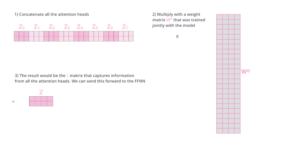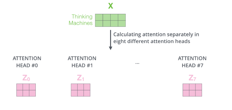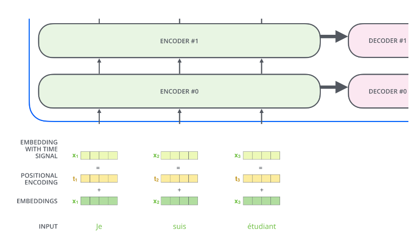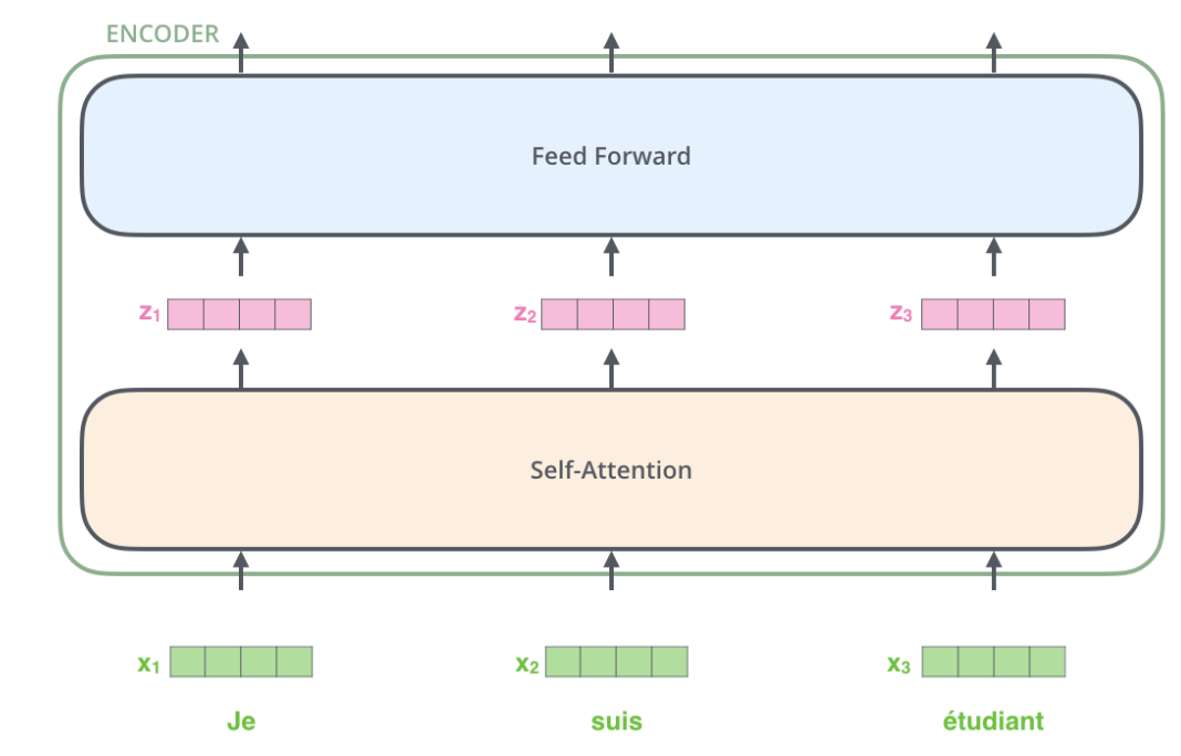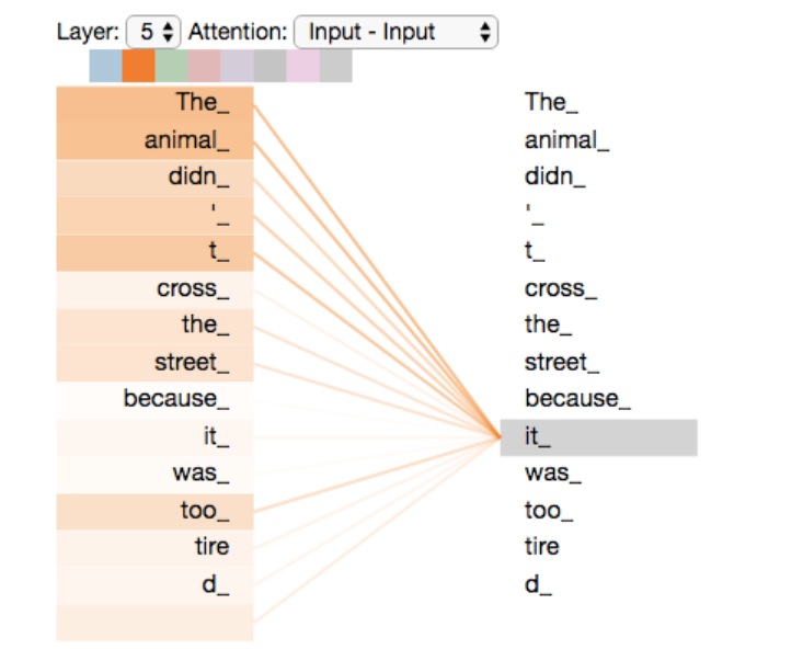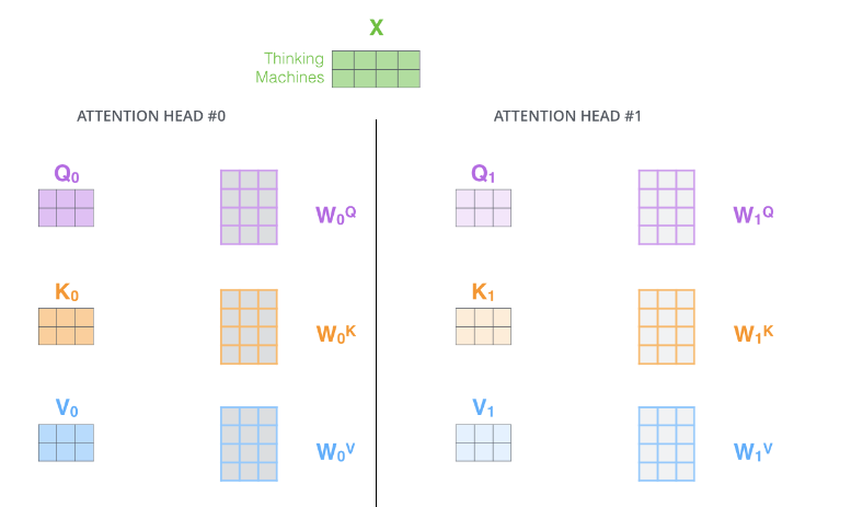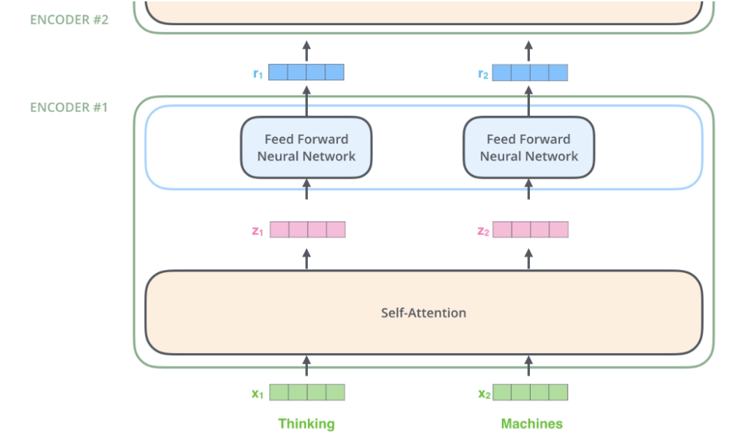 前言 transformer是目前NLP甚至是整個深度學(xué)習(xí)領(lǐng)域不能不提到的框架,同時大部分LLM也是使用其進(jìn)行訓(xùn)練生成模型,所以transformer幾乎是目前每一個機器人開發(fā)者或者人工智能開發(fā)者不能越過的一個框架。接下來本文將從頂層往下去一步步掀開transformer的面紗。 transformer概述 Transformer模型來自論文Attention Is All You Need。(https://arxiv.org/abs/1706.03762) 在論文中最初是為了提高機器翻譯的效率,它使用了Self-Attention機制和Position Encoding去替代RNN。后來大家發(fā)現(xiàn)Self-Attention的效果很好,并且在其它的地方也可以使用Transformer模型。并引出后面的BERT和GPT系列。 大家一般看到的transformer框架如下圖所示: transformer模型概覽 首先把模型看成一個黑盒,如下圖所示,對于機器翻譯來說,它的輸入是源語言(法語)的句子,輸出是目標(biāo)語言(英語)的句子。 把黑盒子稍微打開一點,Transformer(或者任何的NMT系統(tǒng))可以分成Encoder和Decoder兩個部分,如下圖所示。 再展開一點,Encoder由很多結(jié)構(gòu)一樣的Encoder堆疊而成,Decoder也是一樣。如下圖所示。 每一個Encoder的輸入是下一層Encoder輸出,最底層Encoder的輸入是原始的輸入(法語句子);Decoder也是類似,但是最后一層Encoder的輸出會輸入給每一個Decoder層,這是Attention機制的要求。 每一層的Encoder都是相同的結(jié)構(gòu),它由一個Self-Attention層和一個前饋網(wǎng)絡(luò)(全連接網(wǎng)絡(luò))組成,如下圖所示。 每一層的Decoder也是相同的結(jié)構(gòu),它除了Self-Attention層和全連接層之外還多了一個Attention層,這個Attention層使得Decoder在解碼時會考慮最后一層Encoder所有時刻的輸出。它的結(jié)構(gòu)如下圖所示。 transformer流程串聯(lián) transformer的串流需要tensor的加入,輸入的句子需要通過Embedding把它變成一個連續(xù)稠密的向量,如下圖所示。 Embedding之后的序列會輸入Encoder,首先經(jīng)過Self-Attention層然后再經(jīng)過全連接層。 我們在計算????時需要依賴所有時刻的輸入??1,…,????,這是可以用矩陣運算一下子把所有的????計算出來的。而全連接網(wǎng)絡(luò)的計算則完全是獨立的,計算i時刻的輸出只需要輸入????就足夠了,因此很容易并行計算。下圖更加明確地表達(dá)了這一點。圖中Self-Attention層是一個大的方框,表示它的輸入是所有的??1,…,????,輸出是??1,…,????。而全連接層每個時刻是一個方框(但不同時刻的參數(shù)是共享的),表示計算????只需要????。此外,前一層的輸出??1,…,????直接輸入到下一層。 Self-Attention介紹 比如我們要翻譯如下句子”The animal didn’t cross the street because it was too tired”(這個動物無法穿越馬路,因為它太累了)。這里的it到底指代什么呢,是animal還是street?要知道具體的指代,我們需要在理解it的時候同時關(guān)注所有的單詞,重點是animal、street和tired,然后根據(jù)知識(常識)我們知道只有animal才能tired,而street是不能tired的。Self-Attention用Encoder在編碼一個詞的時候會考慮句子中所有其它的詞,從而確定怎么編碼當(dāng)前詞。如果把tired換成narrow,那么it就指代的是street了。 下圖是模型的最上一層Encoder的Attention可視化圖。這是tensor2tensor這個工具輸出的內(nèi)容。我們可以看到,在編碼it的時候有一個Attention Head(后面會講到)注意到了Animal,因此編碼后的it有Animal的語義。 下面我們詳細(xì)的介紹Self-Attention是怎么計算的,首先介紹向量的形式逐個時刻計算,這便于理解,接下來我們把它寫出矩陣的形式一次計算所有時刻的結(jié)果。 對于輸入的每一個向量(第一層是詞的Embedding,其它層是前一層的輸出),我們首先需要生成3個新的向量Q、K和V,分別代表查詢(Query)向量、Key向量和Value向量。Q表示為了編碼當(dāng)前詞,需要去注意(attend to)其它(其實也包括它自己)的詞,我們需要有一個查詢向量。而Key向量可以認(rèn)為是這個詞的關(guān)鍵的用于被檢索的信息,而Value向量是真正的內(nèi)容。 具體的計算過程如下圖所示。比如圖中的輸入是兩個詞”thinking”和”machines”,我們對它們進(jìn)行Embedding(這是第一層,如果是后面的層,直接輸入就是向量了),得到向量??1,??2。接著我們用3個矩陣分別對它們進(jìn)行變換,得到向量??1,??1,??1和??2,??2,??2。比如??1=??1????,圖中??1的shape是1x4,????是4x3,得到的??1是1x3。其它的計算也是類似的,為了能夠使得Key和Query可以內(nèi)積,我們要求????和????的shape是一樣的,但是并不要求????和它們一定一樣(雖然實際論文實現(xiàn)是一樣的)。 每個時刻t都計算出????,????,????之后,我們就可以來計算Self-Attention了。以第一個時刻為例,我們首先計算??1和??1,??2的內(nèi)積,得到score,過程如下圖所示。 接下來使用softmax把得分變成概率,注意這里把得分除以8(????)之后再計算的softmax,根據(jù)論文的說法,這樣計算梯度時會更加穩(wěn)定(stable)。計算過程如下圖所示。 接下來用softmax得到的概率對所有時刻的V求加權(quán)平均,這樣就可以認(rèn)為得到的向量根據(jù)Self-Attention的概率綜合考慮了所有時刻的輸入信息,計算過程如下圖所示。 這里只是演示了計算第一個時刻的過程,計算其它時刻的過程是完全一樣的。 softmax示例代碼: