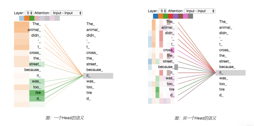 特別注意,以上過程是可以并行計算的。 Multi-Head Attention 論文還提出了Multi-Head Attention的概念。其實很簡單,前面定義的一組Q、K和V可以讓一個詞attend to相關(guān)的詞,我們可以定義多組Q、K和V,它們分別可以關(guān)注不同的上下文。計算Q、K和V的過程還是一樣,不過現(xiàn)在變換矩陣從一組(????,????,????)變成了多組(????0,????0,????0) ,(????1,????1,????1)。如下圖所示。 對于輸入矩陣(time_step, num_input),每一組Q、K和V都可以得到一個輸出矩陣Z(time_step, num_features)。如下圖所示。 但是后面的全連接網(wǎng)絡(luò)需要的輸入是一個矩陣而不是多個矩陣,因此我們可以把多個head輸出的Z按照第二個維度拼接起來,但是這樣的特征有一些多,因此Transformer又用了一個線性變換(矩陣????)對它進(jìn)行了壓縮。這個過程如下圖所示。 上面的步驟涉及很多步驟和矩陣運算,我們用一張大圖把整個過程表示出來,如下圖所示。 我們已經(jīng)學(xué)習(xí)了Transformer的Self-Attention機制,下面我們通過一個具體的例子來看看不同的Attention Head到底學(xué)習(xí)到了什么樣的語義。 從上面兩圖的對比也能看出使用多個Head的好處——每個Head(在數(shù)據(jù)的驅(qū)動下)學(xué)習(xí)到不同的語義。 位置編碼(Positional Encoding) 我們的目的是用Self-Attention替代RNN,RNN能夠記住過去的信息,這可以通過Self-Attention“實時”的注意相關(guān)的任何詞來實現(xiàn)等價(甚至更好)的效果。RNN還有一個特定就是能考慮詞的順序(位置)關(guān)系,一個句子即使詞完全是相同的但是語義可能完全不同,比如”北京到上海的機票”與”上海到北京的機票”,它們的語義就有很大的差別。我們上面的介紹的Self-Attention是不考慮詞的順序的,如果模型參數(shù)固定了,上面兩個句子的北京都會被編碼成相同的向量。但是實際上我們可以期望這兩個北京編碼的結(jié)果不同,前者可能需要編碼出發(fā)城市的語義,而后者需要包含目的城市的語義。而RNN是可以(至少是可能)學(xué)到這一點的。當(dāng)然RNN為了實現(xiàn)這一點的代價就是順序處理,很難并行。 為了解決這個問題,我們需要引入位置編碼,也就是t時刻的輸入,除了Embedding之外(這是與位置無關(guān)的),我們還引入一個向量,這個向量是與t有關(guān)的,我們把Embedding和位置編碼向量加起來作為模型的輸入。這樣的話如果兩個詞在不同的位置出現(xiàn)了,雖然它們的Embedding是相同的,但是由于位置編碼不同,最終得到的向量也是不同的。 位置編碼有很多方法,其中需要考慮的一個重要因素就是需要它編碼的是相對位置的關(guān)系。比如兩個句子:”北京到上海的機票”和”你好,我們要一張北京到上海的機票”。顯然加入位置編碼之后,兩個北京的向量是不同的了,兩個上海的向量也是不同的了,但是我們期望Query(北京1)Key(上海1)卻是等于Query(北京2)Key(上海2)的。具體的編碼算法我們在代碼部分再介紹。位置編碼加入后的模型如下圖所示。 一個具體的位置編碼的例子如下圖所示。 殘差和歸一化 每個Self-Attention層都會加一個殘差連接,然后是一個LayerNorm層,如下圖所示。 下圖展示了更多細(xì)節(jié):輸入??1,??2經(jīng)self-attention層之后變成??1,??2,然后和殘差連接的輸入??1,??2加起來,然后經(jīng)過LayerNorm層輸出給全連接層。全連接層也是有一個殘差連接和一個LayerNorm層,最后再輸出給上一層。 Decoder和Encoder是類似的,如下圖所示,區(qū)別在于它多了一個Encoder-Decoder Attention層,這個層的輸入除了來自Self-Attention之外還有Encoder最后一層的所有時刻的輸出。Encoder-Decoder Attention層的Query來自前面一層,而Key和Value則來自Encoder的輸出。 此外在解碼器的編碼器-解碼器注意力層中,掩碼的使用非常關(guān)鍵,以確保解碼器在生成每個目標(biāo)詞時只能使用到源語言句子的信息和它之前已經(jīng)生成的目標(biāo)詞的信息 pytorch實現(xiàn)transformer