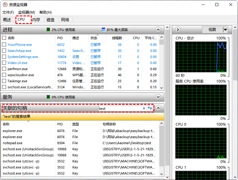 3. 在“CPU”界面“關(guān)聯(lián)的句柄”處搜索待刪除文件或文件夾的名字,也可以是絕對(duì)路徑。然后,在下方會(huì)列出相關(guān)聯(lián)的搜索結(jié)果。 ![]() 4. 找到打開的程序,可以看到我這里是因?yàn)閚otepad打開了里面的一個(gè)文本文檔導(dǎo)致文件夾不能刪除。右鍵點(diǎn)擊并選擇“結(jié)束進(jìn)程”。 ![]()