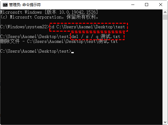 方法2:文件粉碎文件夾正在使用無法刪除怎么辦?在安全工具中使用“文件粉碎”功能也可以幫助你徹底粉碎無法刪除的文件。一般的安全工具中都有,如騰訊電腦管家和360安全衛(wèi)士。 ![]() 打開之后選擇要粉碎的文件或目錄,然后選擇“粉碎”即可。 方法3:使用命令提示符刪除文件夾情況說明:在桌面存了一個(gè)“test”的文件夾,文件夾里有一個(gè)名為“測(cè)試.txt”的文本文檔,想要通過命令提示符刪除這個(gè)文本文檔。 1. 在搜索框中搜索“cmd”或“命令提示符”,然后在結(jié)果中選擇“以管理員身份運(yùn)行”。 ![]() 2. 在命令提示符窗口中輸入“cd [文件路徑]”,如:“cd C:\Users\Aaomei\Desktop\test”。然后再輸入刪除命令“del / s / q 測(cè)試.txt”。 ![]() 這樣就可以刪除test文件夾下的某個(gè)文件。若要?jiǎng)h除test文件夾下的全部文件,命令使用如下: