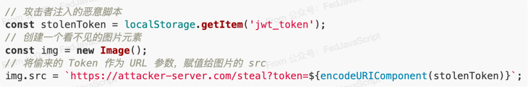 攻擊者只需要注入一行簡單的代碼,就可以將我們存儲(chǔ)的 JWT 發(fā)送到他自己的服務(wù)器上: