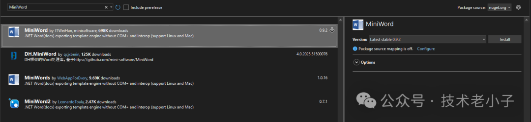 MiniWord通過NuGet包管理器提供,安裝非常簡單: