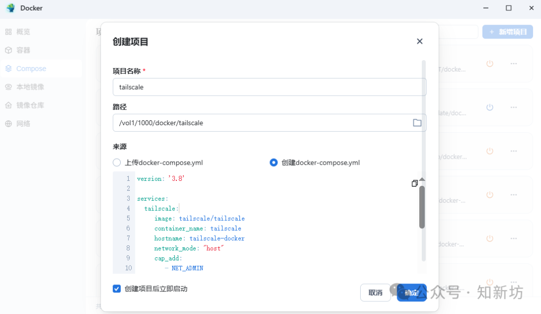 2??打開Docker,Compose新增項目->輸入項目名稱->設(shè)置路徑->上傳或者創(chuàng)建docker-compose.yml把下面代碼復(fù)制進(jìn)去,點擊完成直至構(gòu)建完成