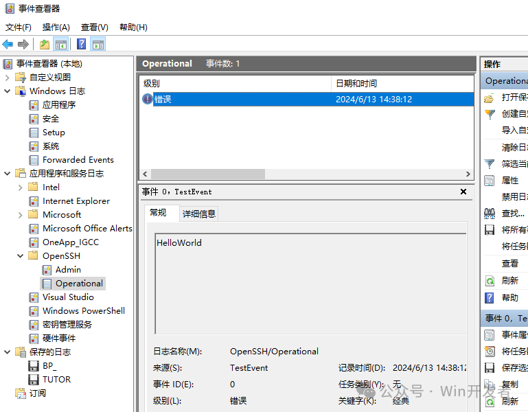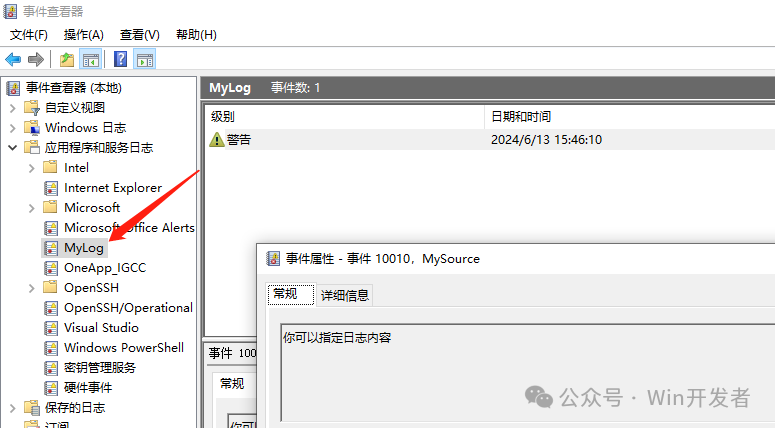 運(yùn)行后到事件查看器查看寫入的日志 ![]() 寫入記錄到自定義日志類別下