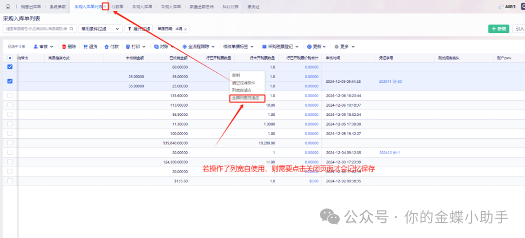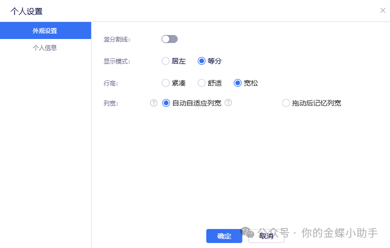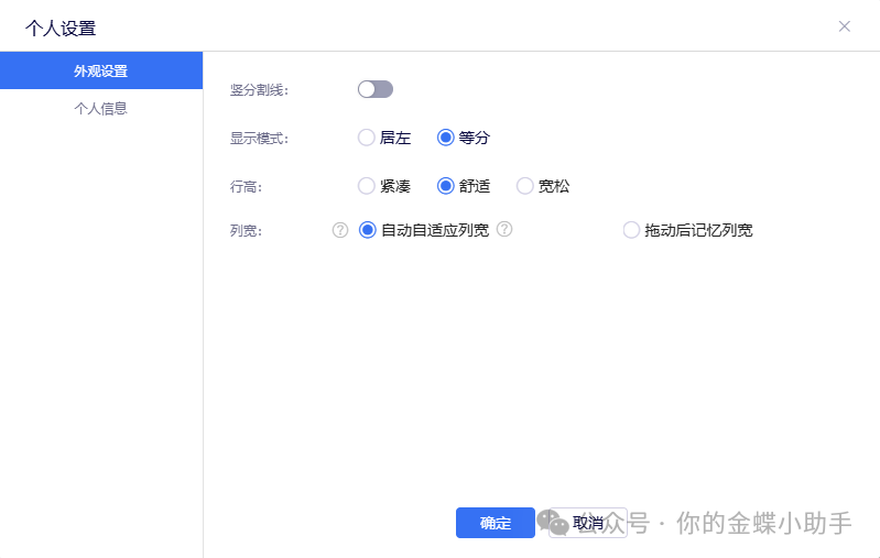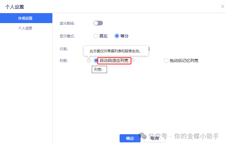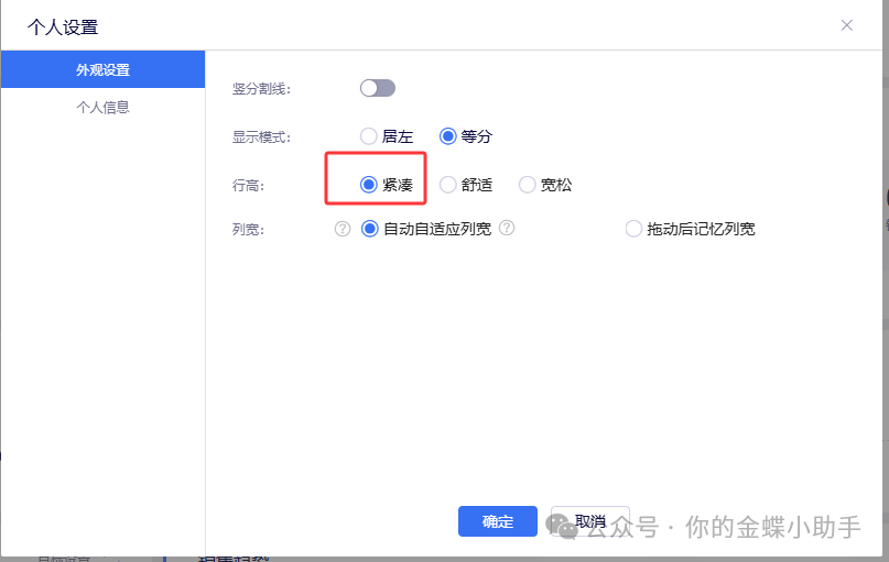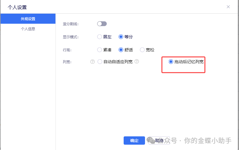 目前系統(tǒng)中的單據(jù),報表的行高、列寬設置可通過賬套中的個人設置控制,點擊系統(tǒng)主界面右上角頭像后,點擊【個人設置】【外觀設置】中可以對行高、和列寬進行調(diào)整行高有:“緊湊”、“舒適”、“寬松”三種列寬有:自動適應列寬、拖動后記憶列寬 兩種1)行高設置a、若設置為“緊湊”打開單據(jù)列表,可以看到行高矮,整體顯示較為緊湊;b、行高設置為“舒適”單據(jù)列表上的高度適中c、行高設置為“寬松”單據(jù)列表行更為寬松2)列寬設置(只針對單據(jù)列表和報表生效)a、列寬設置為“自動自適應列寬”以單據(jù)備注為例,先拖一遍寬度,內(nèi)容很短時會自動縮短列寬;當改成很長的內(nèi)容時,拖動下面的滾動條,列寬會自動變寬。當單據(jù)備注很長時,拖動下面滾動條,列寬會自動變寬。b、列寬設置為“拖動后記憶列寬”手動調(diào)的列寬,不用點擊頁面關閉鍵,也會實時保存列寬但右擊的全部列寬自適應,不實時保存,需點擊頁面關閉鍵保存。