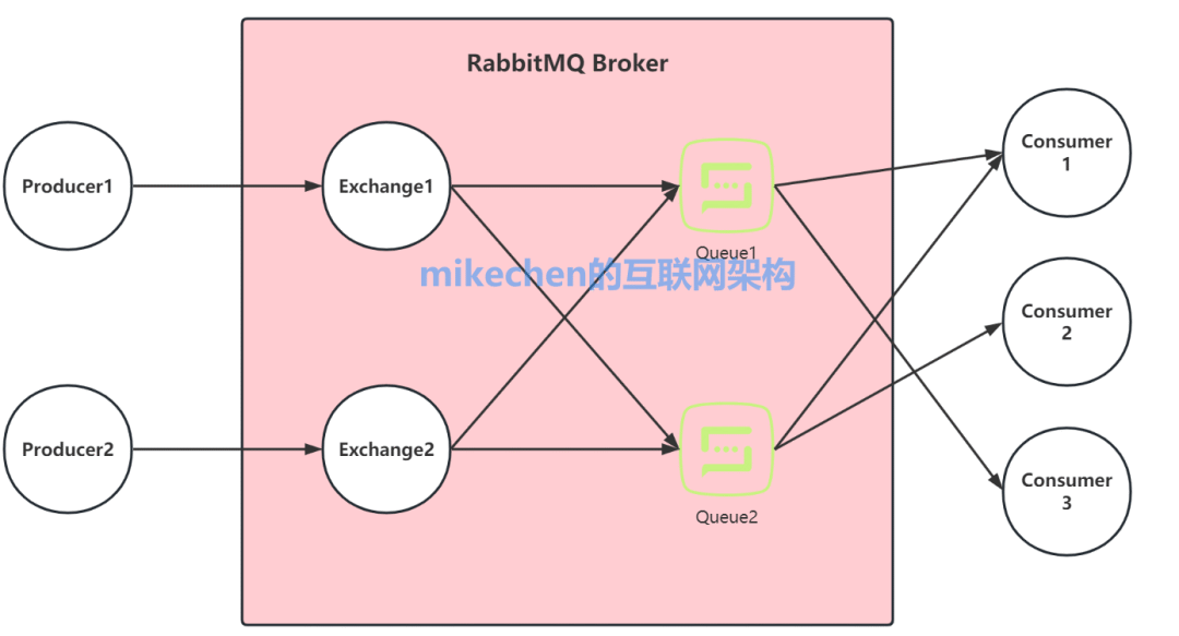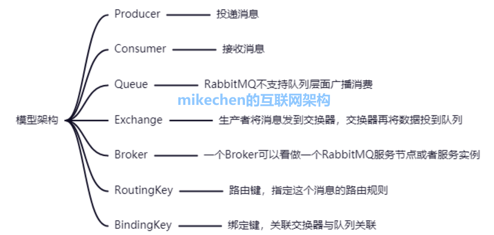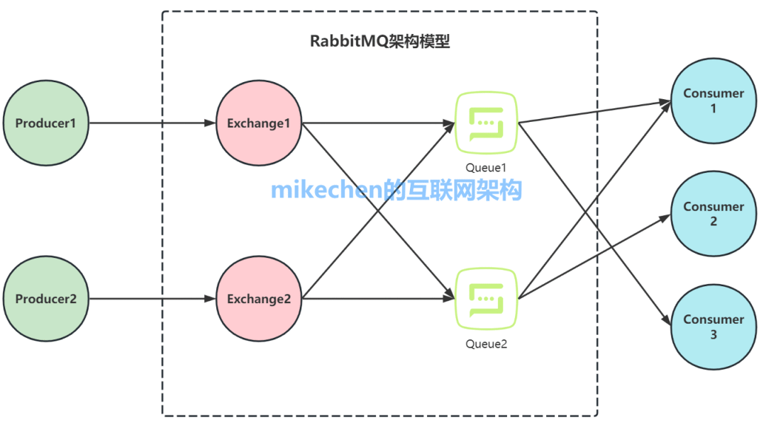 消息中間件是高并發(fā)架構(gòu)的基石,之前談過了RocketMQ和Kafka,今天接著詳解RabbitMQ消息中間件@mikechen RabbitMQRabbitMQ是一款使用Erlang語言開發(fā)的,實現(xiàn)了高級消息隊列協(xié)議(AMQP)的開源消息中間件。 AMQP,即Advanced Message Queuing Protocol,高級消息隊列協(xié)議是應用層協(xié)議的一個開放標準,為面向消息的中間件設計。 Erlang語言,主要用于并發(fā)及分布式系統(tǒng)的開發(fā),在電信領域應用廣泛,OTP作為Erlang語言的一部分,包含了很多基于Erlang開發(fā)的中間件及工具庫。 RabbitMQ特點1.可靠性:RabbitMQ使用一些機制來保證可靠性, 如持久化、傳輸確認及發(fā)布確認等。 2.靈活的路由 :在消息進入隊列之前,通過交換器來路由消息。 3.擴展性:多個RabbitMQ節(jié)點可以組成一個集群,也可以根據(jù)實際業(yè)務情況動態(tài)地擴展 集群中節(jié)點。 4.高可用性:隊列可以在集群中的機器上設置鏡像,使得在部分節(jié)點出現(xiàn)問題的情況下隊 列仍然可用。 5.多種協(xié)議:RabbitMQ除了原生支持AMQP協(xié)議,還支持STOMP, MQTT等多種消息 中間件協(xié)議。 6.多語言客戶端:RabbitMQ 幾乎支持所有常用語言,比如 Java、 Python、 Ruby、 PHP、 C#、 JavaScript 等。 RabbitMQ架構(gòu)設計RabbitMQ架構(gòu),如下圖所示: RabbitMQ架構(gòu)會涉及如下模型:Producer、Consumer、Queue、Exchange、Broker、RoutingKey、BindingKey。