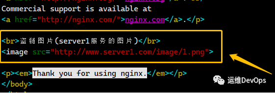 1、首先配置server1服務(wù)器,讓Nginx請求一個(gè)圖片,配置如下: 在nginx根目錄下創(chuàng)建文件夾image,在下面放一個(gè)1.png文件,訪問www.server1.com/image/1.png,如下: 2、配置server2服務(wù)器,修改Nginx默認(rèn)頁面index.html,添加server1的圖片URL,如圖: 訪問頁面,可以看到server1的圖片已經(jīng)加載出來,如圖: