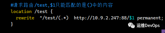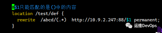 從上圖看出,當(dāng)請(qǐng)求路由為/test,實(shí)際是跳轉(zhuǎn)到了httpd根路徑下的test目錄的index.html文件,為什么會(huì)這樣呢?因?yàn)閞ewrite中的正則(.*) 前面并無其他內(nèi)容,因此此時(shí)匹配的就是上面的路由test,而$1正好對(duì)應(yīng)的是(.*)的內(nèi)容,因此實(shí)際請(qǐng)求路徑就變成了10.9.2.247:88/test注意:在rewrite的正則中,如果有$1、$2,那么實(shí)際匹配的是()中的內(nèi)容,比如: