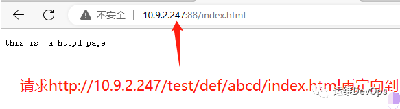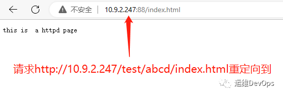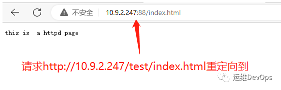 此時(shí)通過瀏覽器請(qǐng)求http://10.9.2.247/test/index.html,將跳轉(zhuǎn)到httpd默認(rèn)路徑下的index.html,因?yàn)?1只能匹配括號(hào)的內(nèi)容,此時(shí)(.*)匹配的內(nèi)容就是index.html,因此實(shí)際重定向的路徑就是http://10.9.2.247:88/index.html,^/test表示匹配以test開頭的路由,location中是test,這里匹配的開頭也要是test,不能所以寫,會(huì)報(bào)錯(cuò)