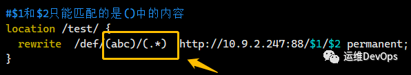 注意看,上面的rewrite的/abcd/前面是沒有”^”的,如果加了這個(gè)”^”后,再按照上面的路徑請(qǐng)求就會(huì)異常,因?yàn)椤盺”表示匹配開頭,加了后表示請(qǐng)求路由以abcd開頭,那么請(qǐng)求路徑就會(huì)變成http://10.9.2.247/abcd/index.html,但是location中也沒有abcd這個(gè),所以請(qǐng)求也不會(huì)成功,因此要么不加”^”,在請(qǐng)求的時(shí)候直接將rewrite路由加在location路由后面,要不就像上面2.4中的那樣,把location的路由也寫在rewrite中,并加前綴”^”匹配6、下面例子使用$1和$2獲取兩個(gè)參數(shù),如圖: