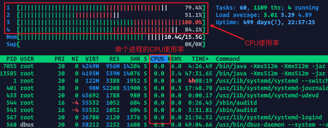 服務(wù)器負(fù)載分析在性能調(diào)優(yōu)時(shí),需要先對(duì)服務(wù)器負(fù)載進(jìn)行分析,通常而言,我們主要分析CPU使用率、內(nèi)存使用率、磁盤I/O,服務(wù)器負(fù)載和帶寬使用情況。 CPU使用率CPU使用率反應(yīng)的是CPU的忙碌情況。當(dāng)CPU達(dá)到100%時(shí),部分進(jìn)程會(huì)進(jìn)入等待狀態(tài),CPU暫時(shí)不會(huì)對(duì)其進(jìn)行處理。在實(shí)際情況下,為了應(yīng)對(duì)一下突發(fā)性的請(qǐng)求壓力,服務(wù)器CPU使用率一般需要在75%以下。如果一臺(tái)服務(wù)器的CPU使用率多次高于75%,這時(shí)候就考慮增加新的服務(wù)器。 監(jiān)控CPU使用率我推薦大家使用htop工具,可以非常直觀看到CPU使用率、內(nèi)存使用率、及負(fù)載等信息。 使用htop查看CPU負(fù)載首先我們需要安裝htop,以centos為例,安裝命令如下: