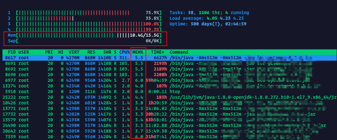 如上圖所示,這是一個(gè)4核CPU服務(wù)器,在截圖的時(shí)候其中3核CPU使用率都超過了75%,再觀察一會(huì)發(fā)現(xiàn)所有CPU的使用率都在85%左右徘徊,說明CPU負(fù)載很高了,需要考慮增加新的服務(wù)器。 內(nèi)存使用率內(nèi)存使用率反應(yīng)的是內(nèi)存的使用情況。內(nèi)存用于存放程序的代碼及數(shù)據(jù),一般分為物理內(nèi)存和虛擬內(nèi)存,其中物理內(nèi)存指的是服務(wù)器的內(nèi)存,而虛擬內(nèi)存指的是硬盤的一塊空間。當(dāng)物理內(nèi)存使用率達(dá)到100%時(shí)將會(huì)使用虛擬內(nèi)存。需要注意的是,虛擬內(nèi)存的讀寫速度遠(yuǎn)遠(yuǎn)低于物理內(nèi)存,如果程序被放在了虛擬內(nèi)存執(zhí)行,那么程序的執(zhí)行效率會(huì)變得很低。 一般而言,服務(wù)器的物理內(nèi)存應(yīng)該保持在80%以下,虛擬內(nèi)存使用率保持在0%。 服務(wù)器內(nèi)存使用情況還是可以通過hop工具進(jìn)行查看