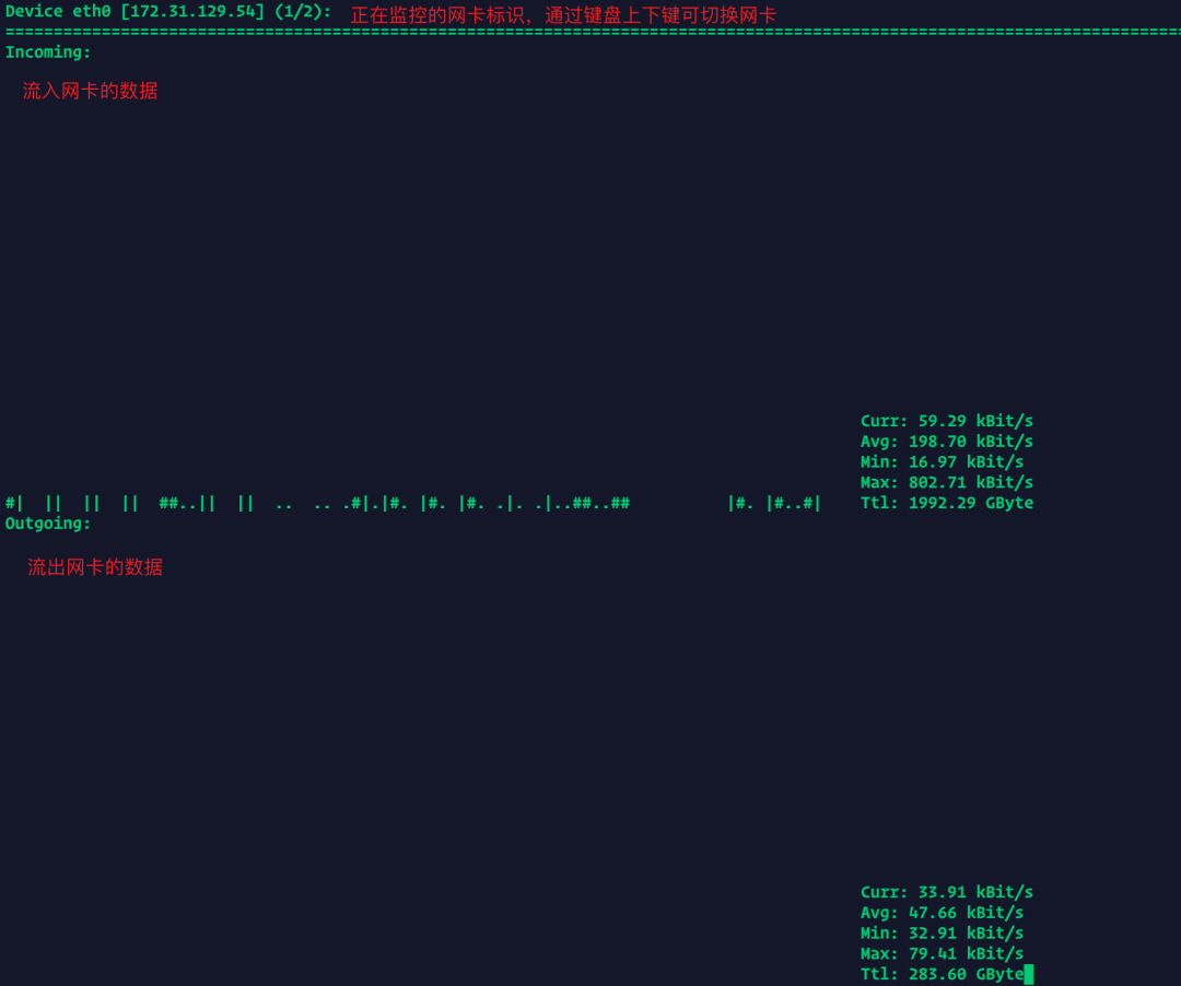 一般情況下服務(wù)器的平均負(fù)載需要小于當(dāng)前服務(wù)器的CPU核數(shù),為了應(yīng)對(duì)突發(fā)狀況,服務(wù)器的平均負(fù)載應(yīng)該在75%即3 以下,很顯然,上圖這臺(tái)服務(wù)器平均負(fù)載超過了75%,需要考慮提升性能了。 網(wǎng)絡(luò)使用情況網(wǎng)絡(luò)使用情況也是監(jiān)控的重要指標(biāo)。當(dāng)帶寬不足時(shí)會(huì)大大增加請(qǐng)求的響應(yīng)時(shí)間。為了防止突發(fā)性并發(fā)壓力,應(yīng)該保證服務(wù)器的帶寬使用率在80%以上。這里需要注意的是,物理網(wǎng)卡限制了服務(wù)器所能使用的最大寬帶。 查看網(wǎng)絡(luò)使用情況我推薦使用 使用nload查看網(wǎng)絡(luò)首先需要安裝nload,以centos為例