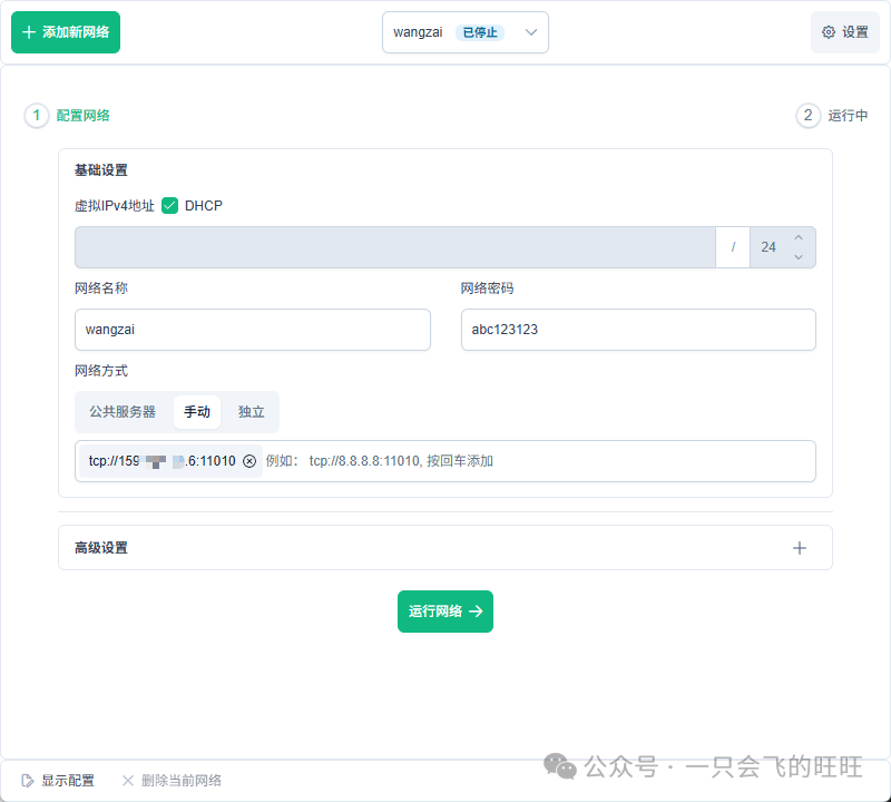 我們只需要配置一個網(wǎng)絡(luò)名稱和密碼,保持默認(rèn)的公共服務(wù)器配置,點(diǎn)擊運(yùn)行網(wǎng)絡(luò),就完成操作了!