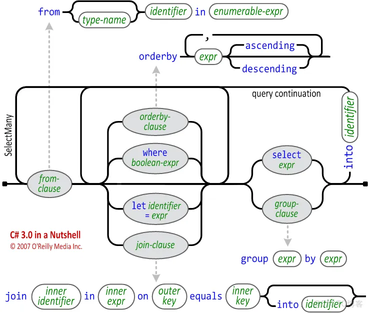 常用方法/語法 | System.Linq 上提供的擴展方法或第三方擴展:Where、OrderBy、Select、Skip、Take、Union | 僅支持編譯器識別的關鍵字:from、where、orderby、group、join、let、select、into、in、on等 |