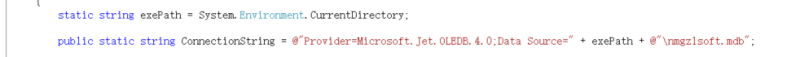 public static string ConnectionString = @"Provider=Microsoft.Jet.OLEDB.4.0;Data Source=" + exePath + @"\nmgzlsoft.mdb";