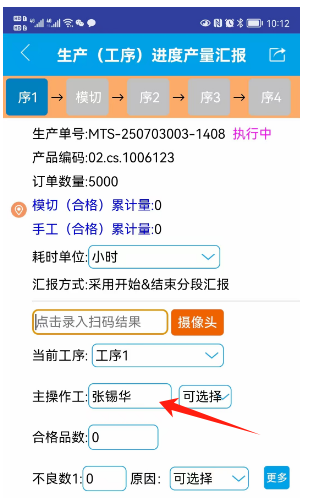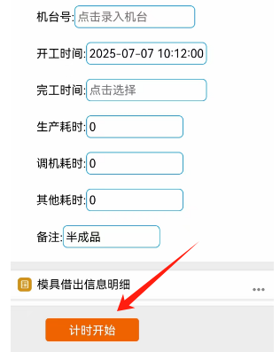 注意:開(kāi)始計(jì)時(shí)匯報(bào),無(wú)需填寫(xiě)數(shù)量,機(jī)臺(tái)等信息 操作完后,等工序完成,重復(fù)操作上述步驟再次進(jìn)入界面