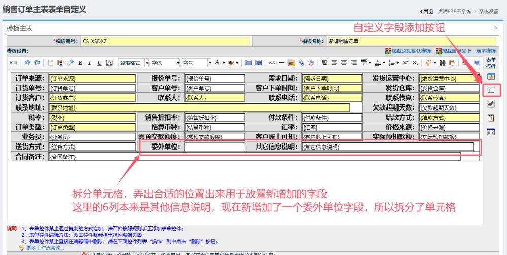 ![]() ![]() 點晴ERP系統(tǒng)的銷售訂單支持添加自定義字段,并帶到送貨單中打印出來,設(shè)置方法如下。 特別說明:本操作需要熟悉HTML和SQL語言,不熟悉者切勿操作! 以管理員身份登錄點晴ERP系統(tǒng)-》銷售管理-》銷售訂單管理-》新增銷售訂單: 點擊右上角的“自定義表單”按鈕:? 在彈出的自定義表單設(shè)置頁面中,先調(diào)整表單樣式,適當(dāng)調(diào)整以上頁面結(jié)構(gòu),弄出一個位置用于放置新增加的字段。最好是直接在HTML頁面源碼模式下修改,可以確保風(fēng)格嚴格一致。這里新增加的字段是“委外單位”,下面是未設(shè)置前的樣式,將“其他信息說明”的輸入框單元格拆分了: