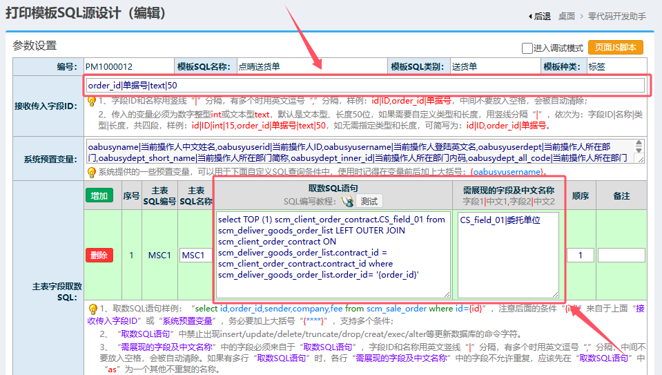這里提供了查詢此自定義字段的SQL設(shè)置,以下填入信息的具體意思和構(gòu)成參見設(shè)置頁面上的相應(yīng)說明: 在“傳入字段ID”中,輸入“order_id|單據(jù)號|text|50”,這個是用于根據(jù)送貨單號唯一識別出自定義字段的關(guān)鍵信息; 在“主表字段取數(shù)SQL”中,取數(shù)SQL語句設(shè)置為“select TOP (1) scm_client_order_contract.CS_field_01 from scm_deliver_goods_order_list LEFT OUTER JOIN scm_client_order_contract ON scm_deliver_goods_order_list.contract_id = scm_client_order_contract.contract_id where scm_deliver_goods_order_list.order_id= '{order_id}'”; 在“需展現(xiàn)的字段及中文名稱”輸入為“CS_field_01|委托單位”。 然后點擊保存按鈕,重新進入打印設(shè)置頁面: